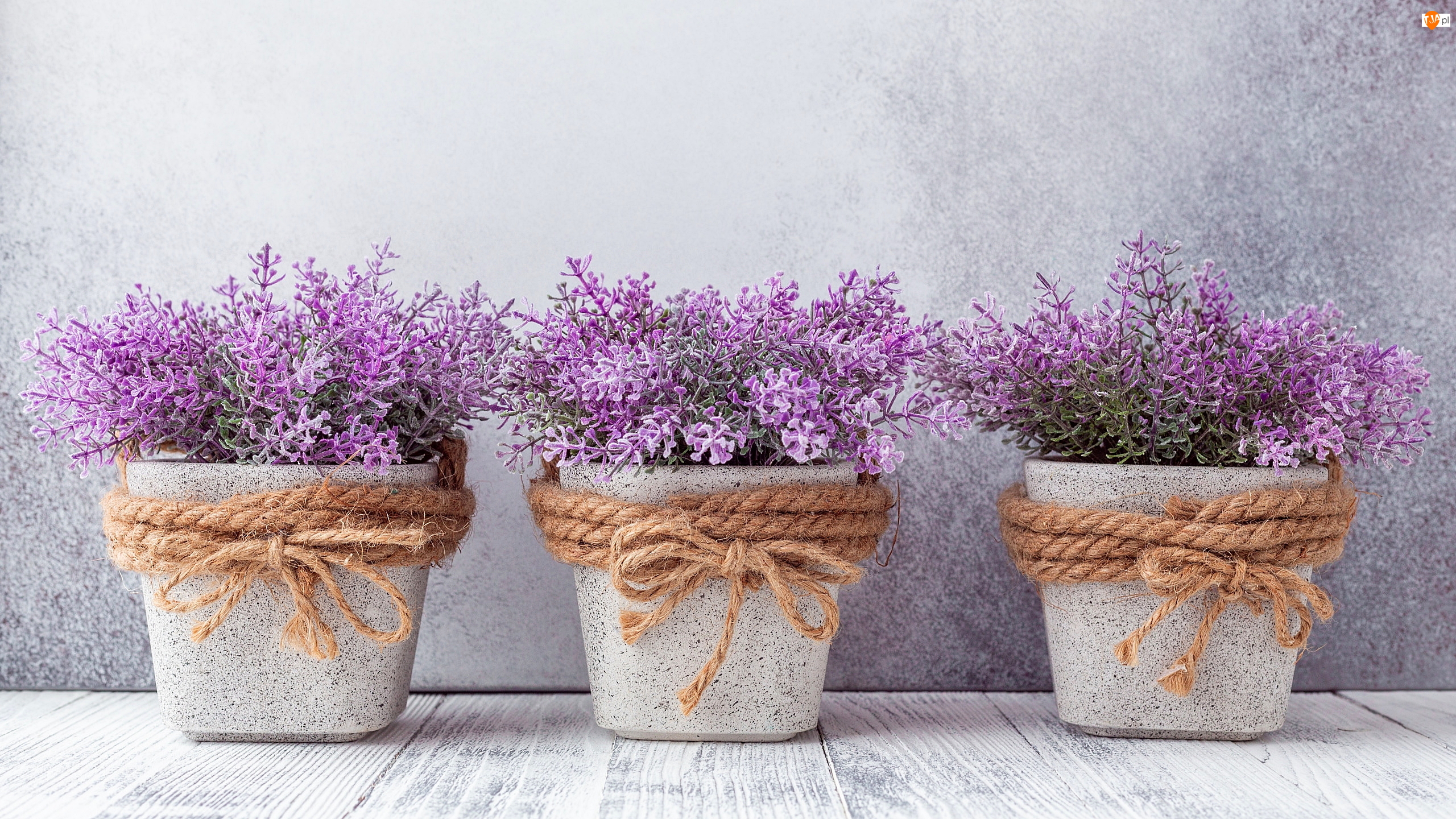 Kwiaty, Fioletowe, Doniczki, Kokardka, Trzy, Sznurek