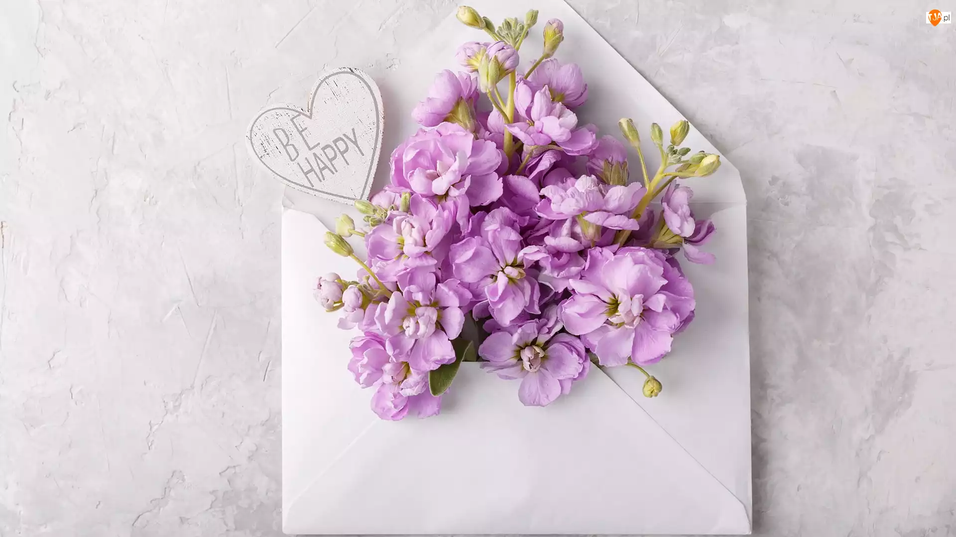 Tło, Kwiaty, Szare, Be Happy, Koperta, Drewniane, Serce, Fioletowe, Napis
