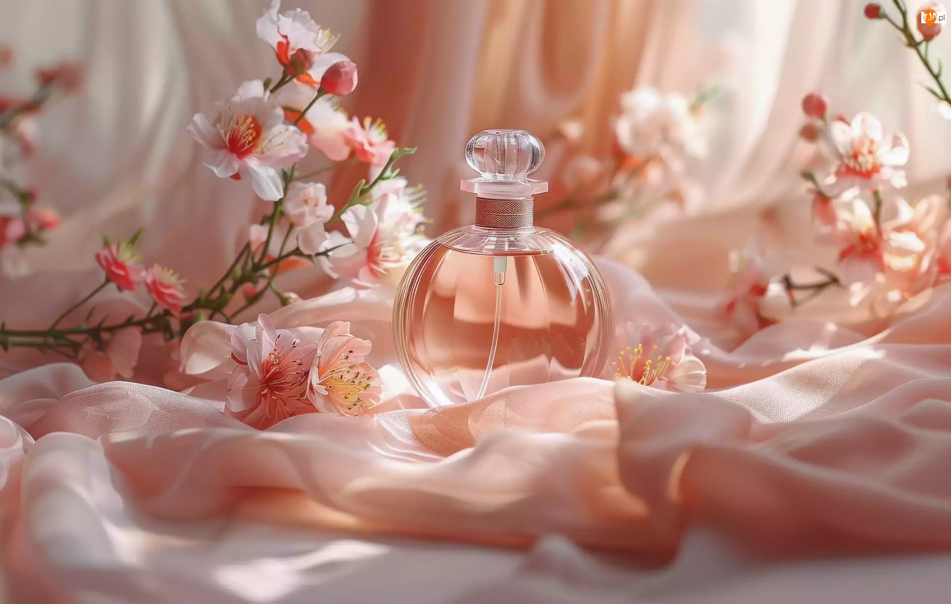 Flakon, Kwiaty, Grafika, Perfumy, Kompozycja, Tkan