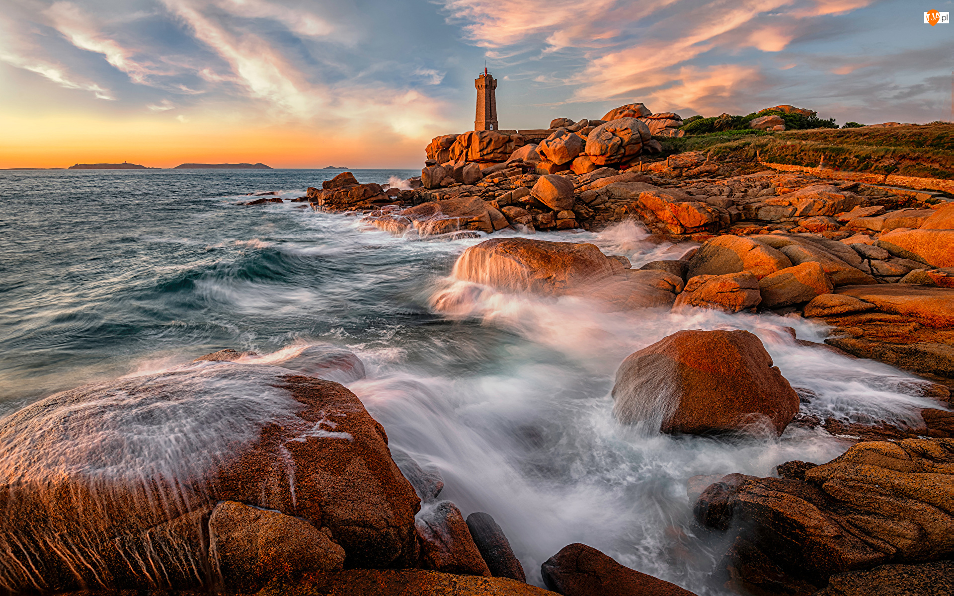 Francja, Latarnia morska Men Ruz, Perros-Guirec, Morze, Ploumanach, Kamienie, Skały, Wybrzeże, Wschód słońca