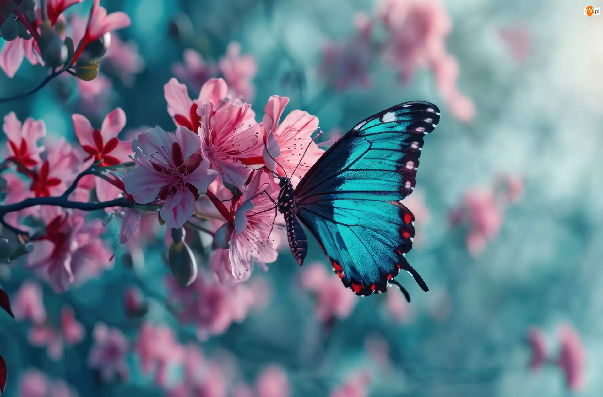 Gałąź, Motyl, Kwiaty, Różowe, Niebieski