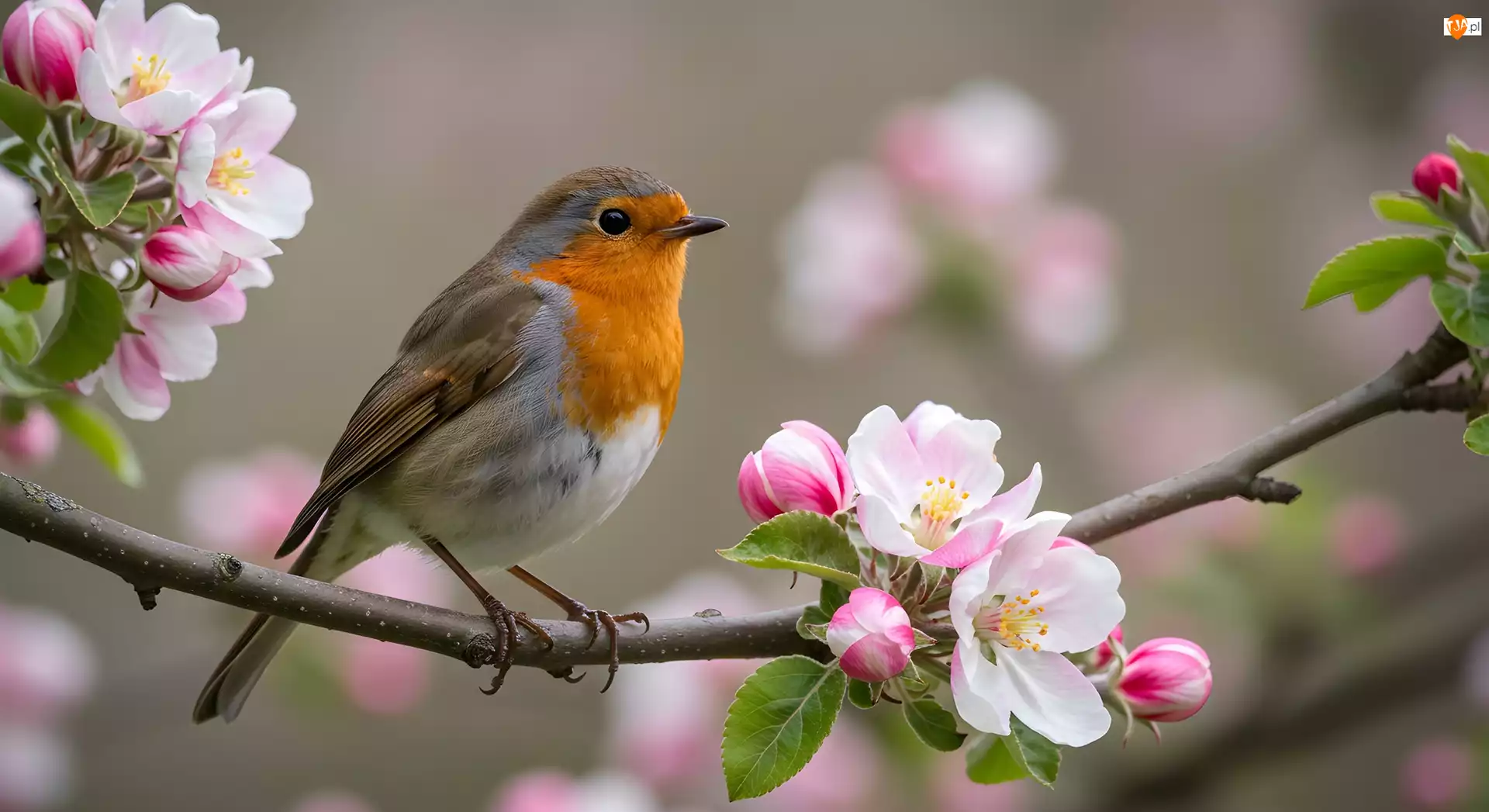 Gałązka, Drzewo owocowe, Ptak, Rudzik, Kwiaty