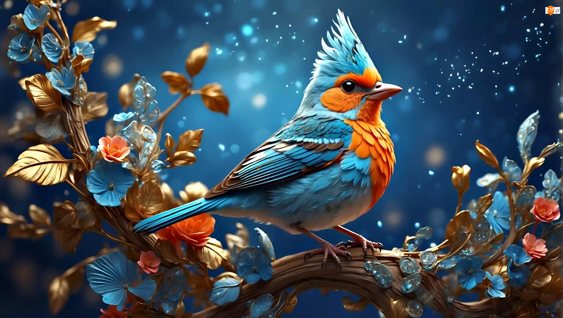 Gałązka, Grafika, Kolorowy, Ptak, Kwiaty