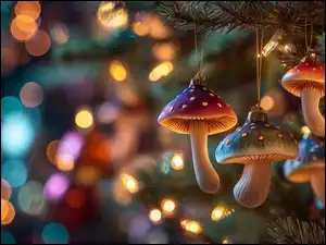 Choinka, Grafika AI, Grzybki, Bombki, Boże Narodzenie