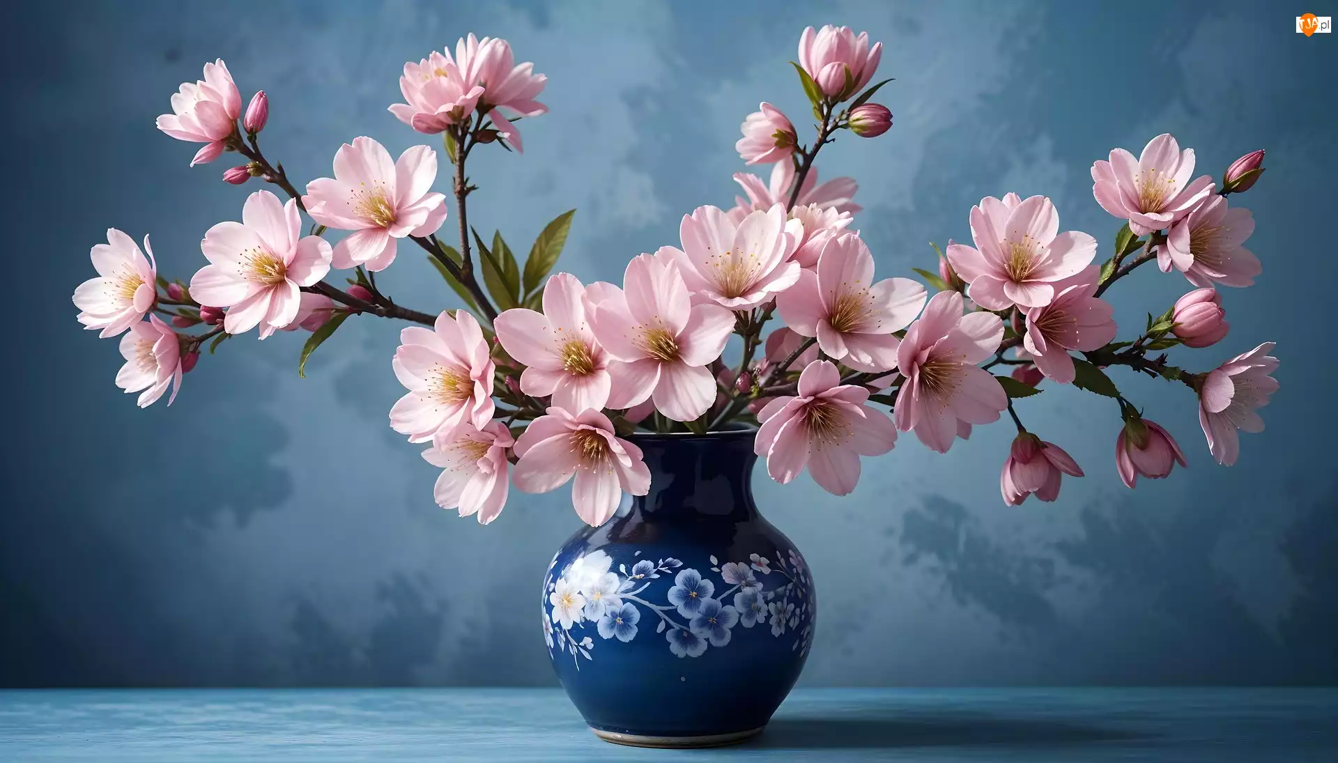 Gałązki kwitnącej wiśni w wazonie na niebieski