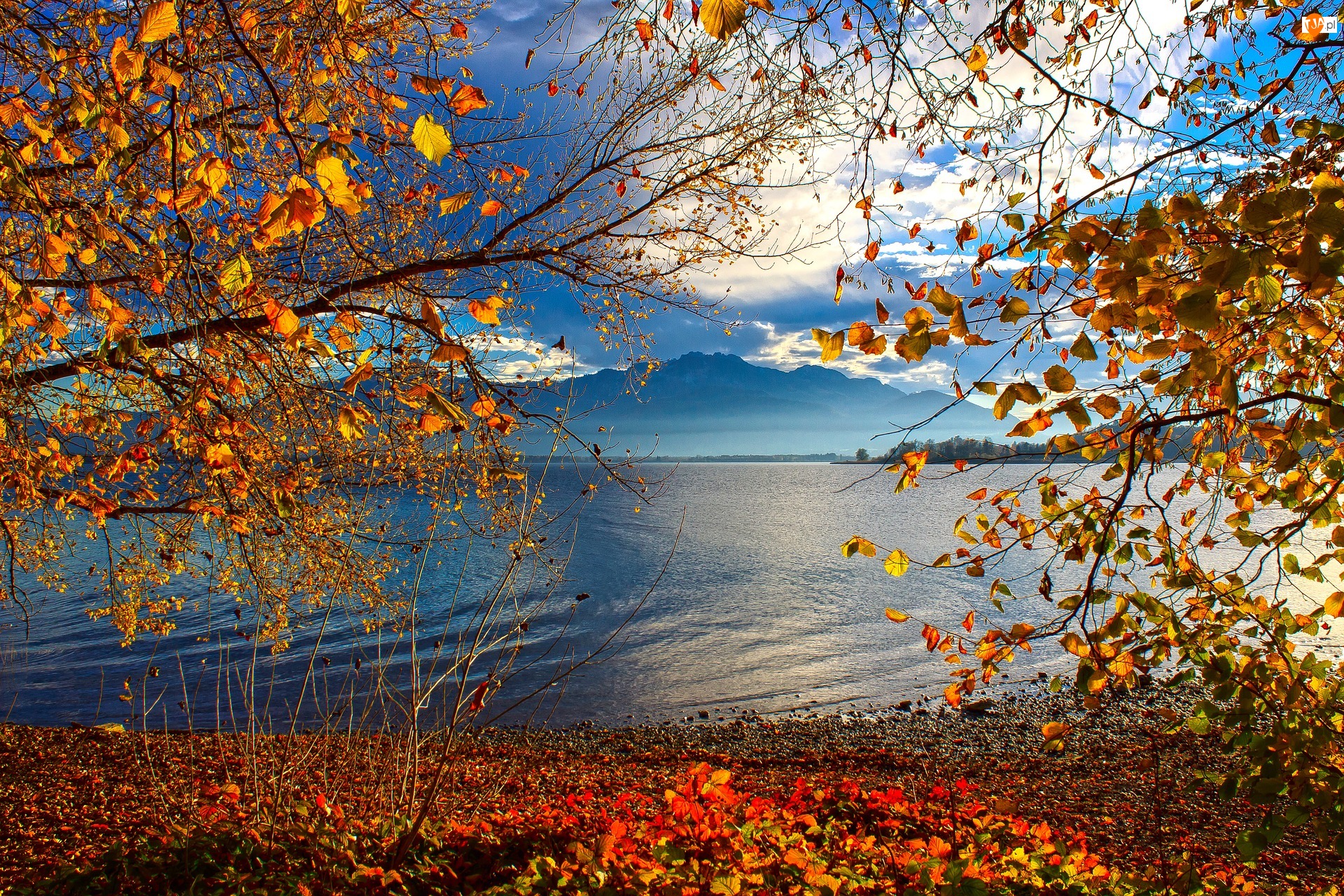 Drzewa, Jesień, Alpy Salzburskie, Niemcy, Jezioro Chiemsee, Bawaria
