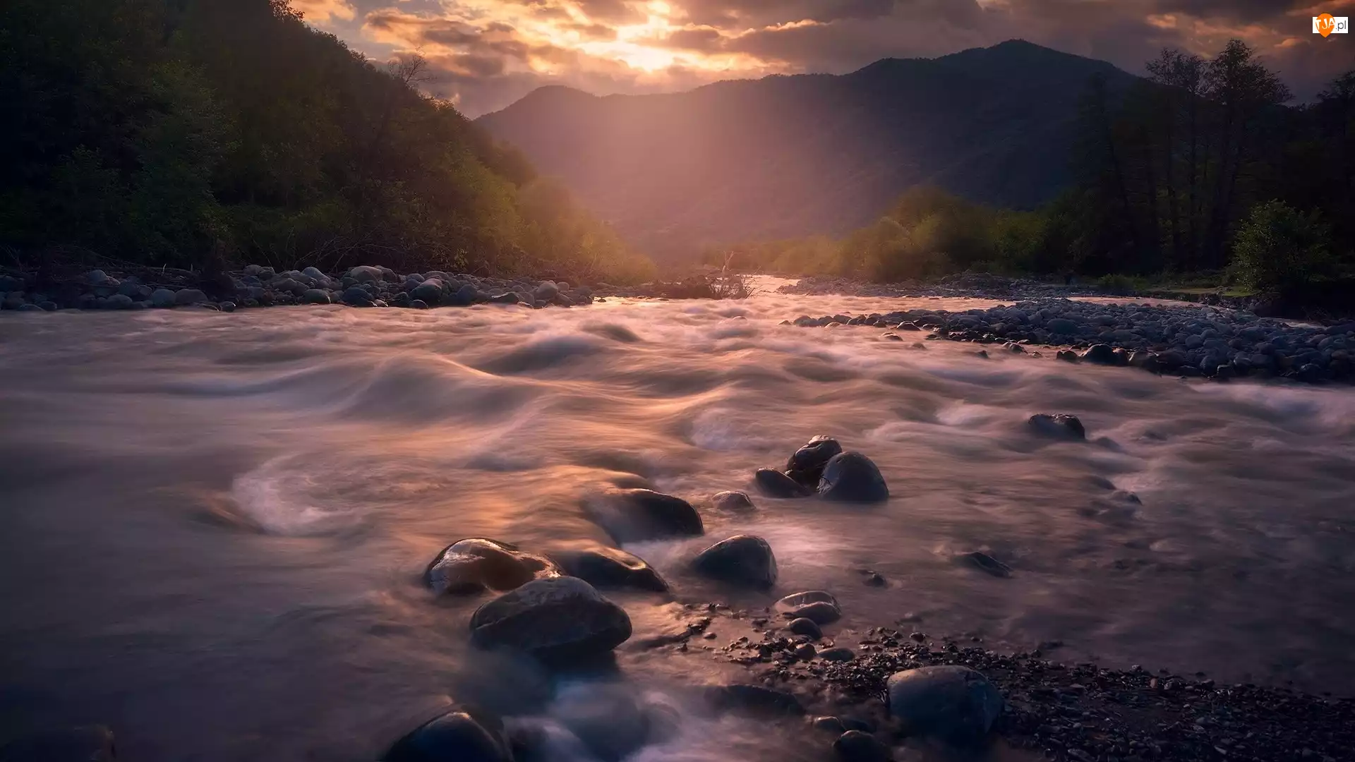 Góry, Drzewa, Kamienie, Rzeka, Las