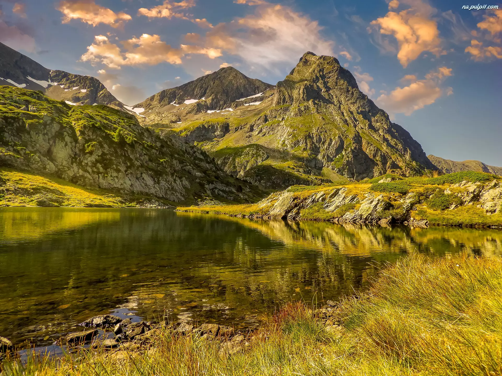 Trawa, Chmury, Jezioro, Góry, Niebo