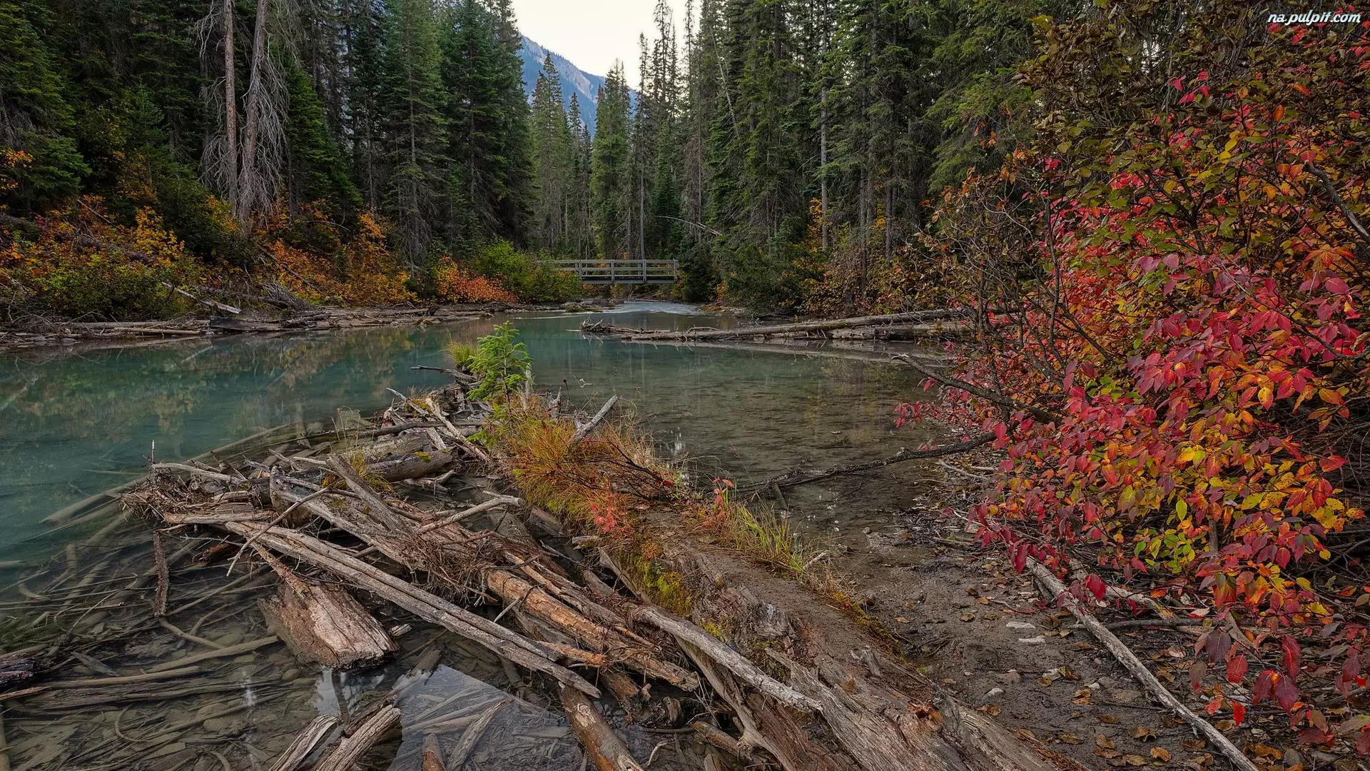 Góry, Jesień, Mostek, Park Narodowy Yoho Rzeka, Las, Jezioro Szmaragdowe