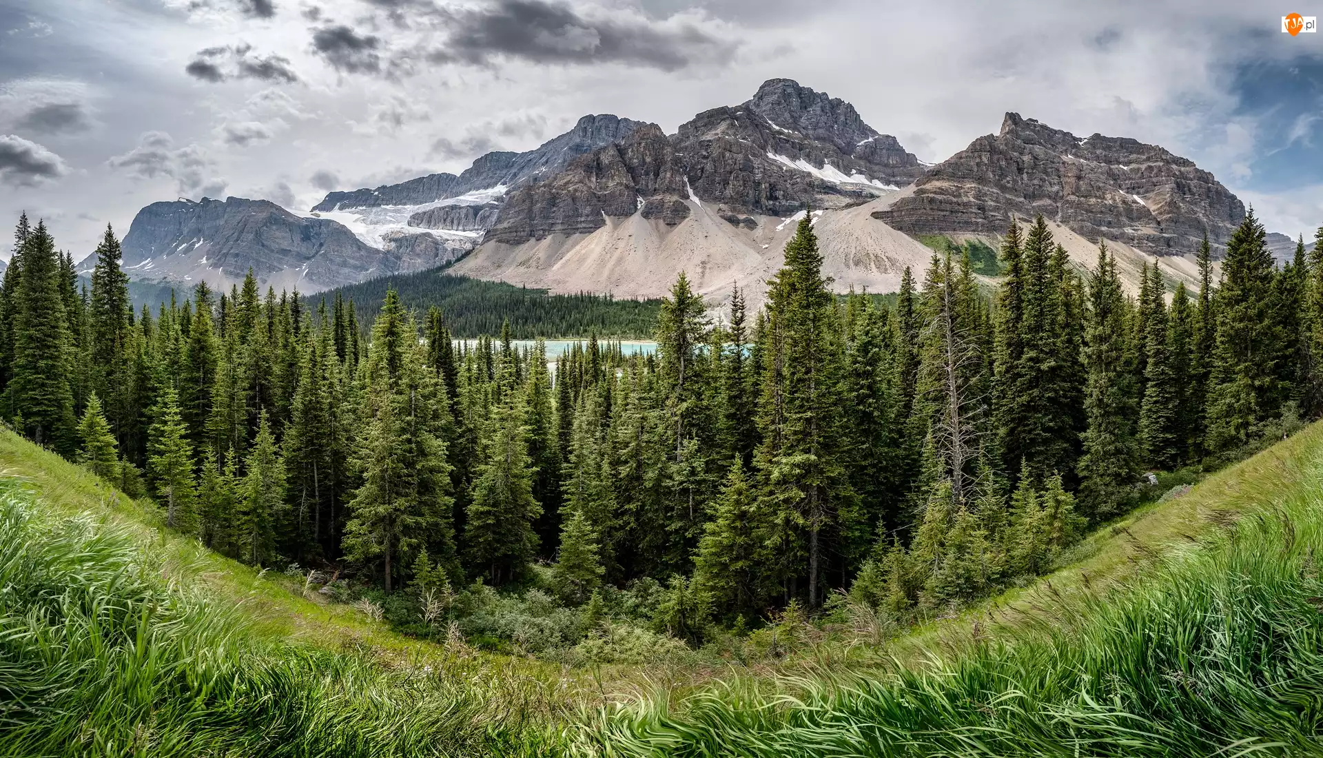 Góry, Jezioro Bow Lake, Kanada, Park Narodowy Banff, Prowincja Alberta, Chmury, Drzewa