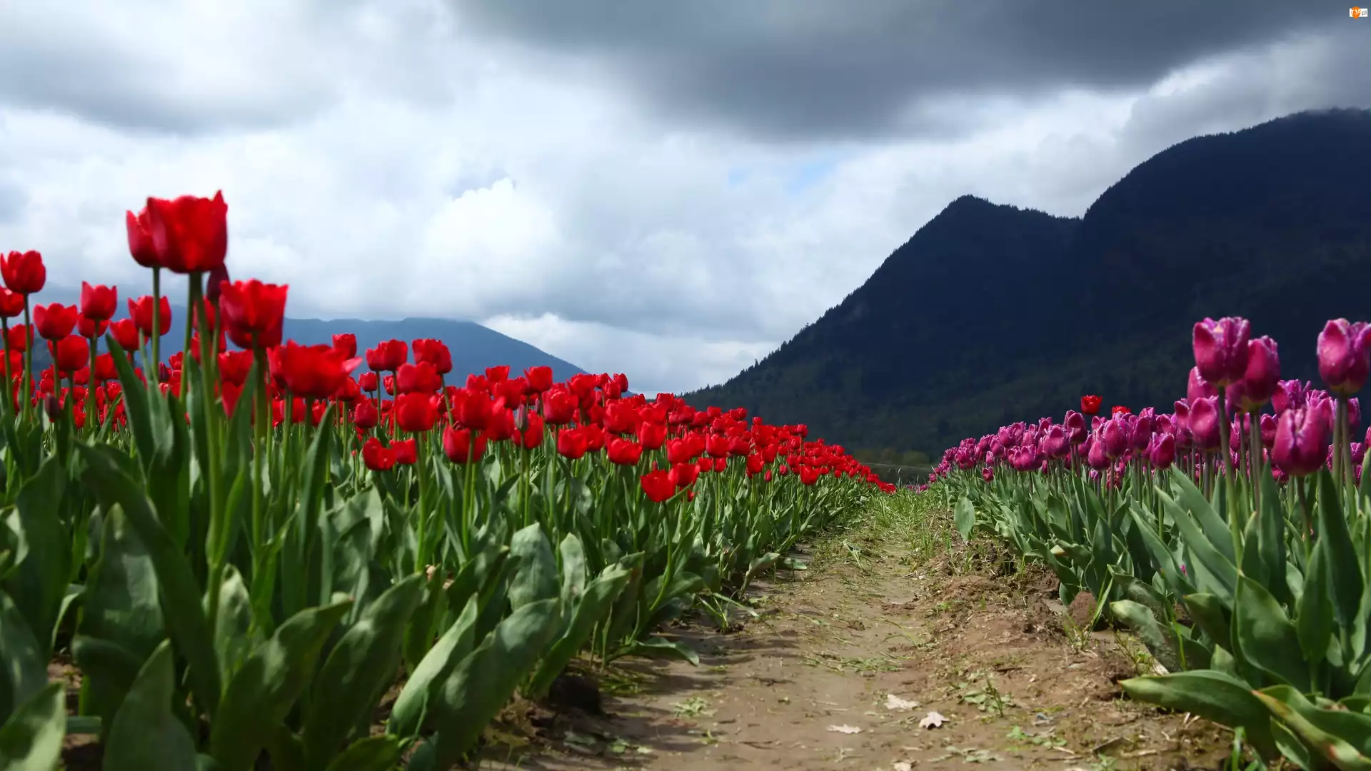 Góry, Ścieżka, Chmury, Niebo, Tulipany