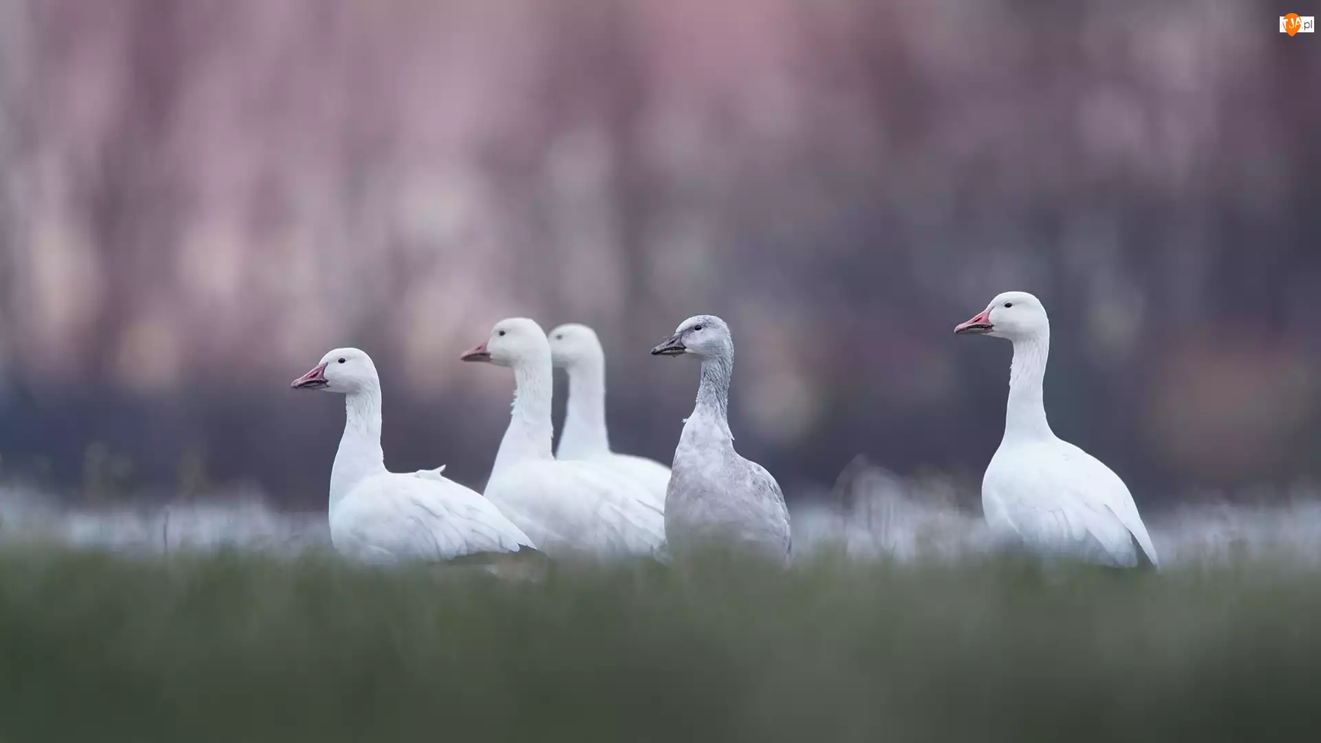 Śnieżyce duże, Rozmycie, Gęsi, Ptaki, Trawa