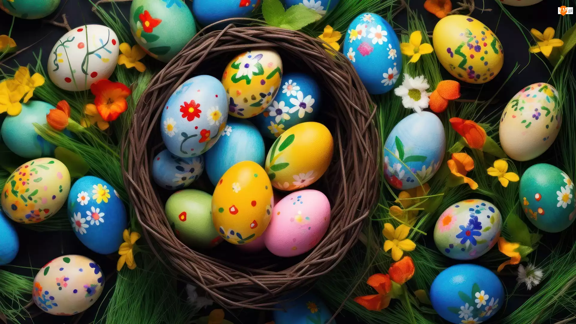 Gniazdo, Wielkanoc, Pisanki, Kolorowe, Kwiaty
