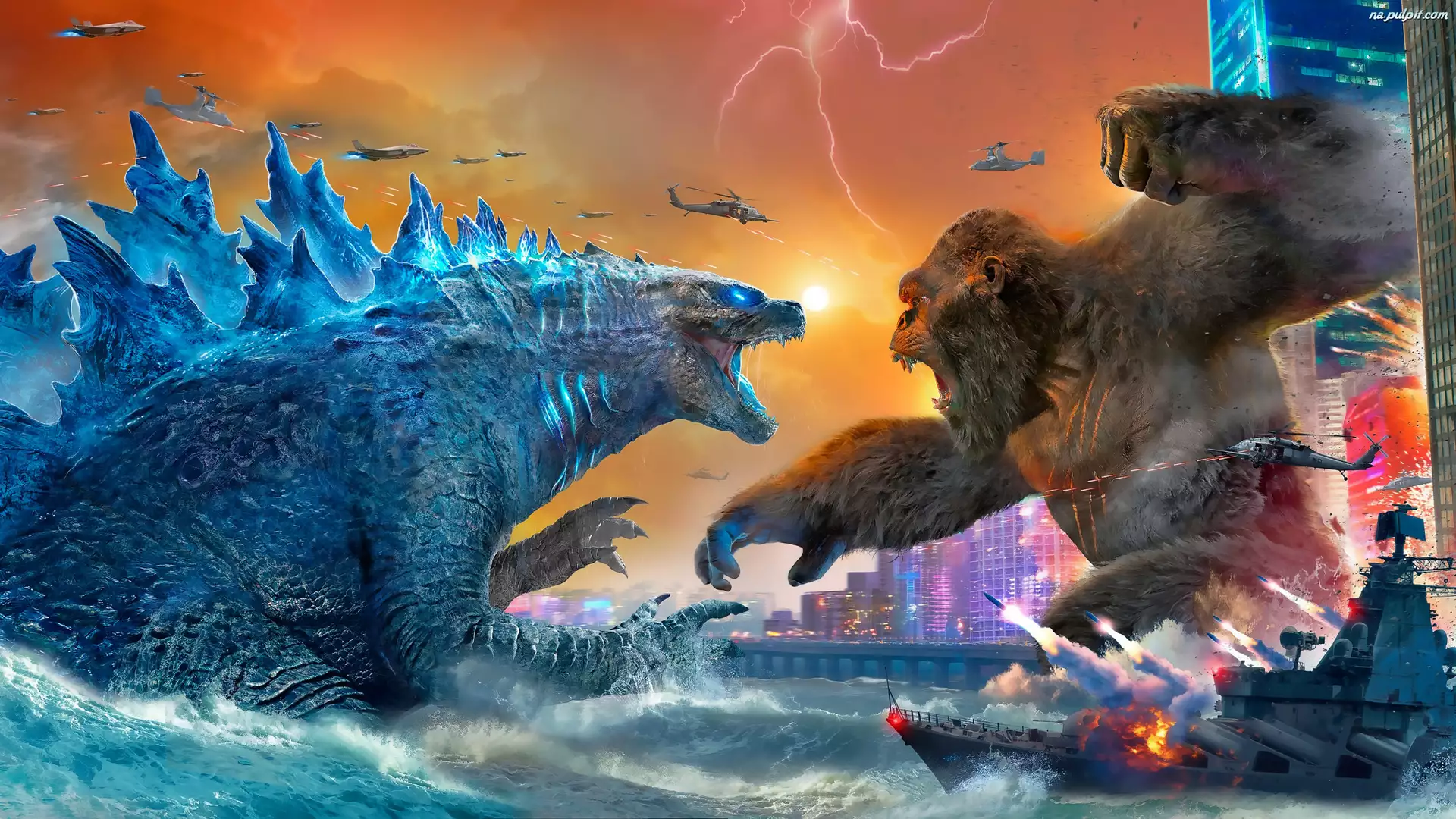 Morze, Godzilla vs Kong, Helikoptery, Plakat, Samoloty, Film, Godzilla, Statek, Postaci, Kong, Walka, Budynki
