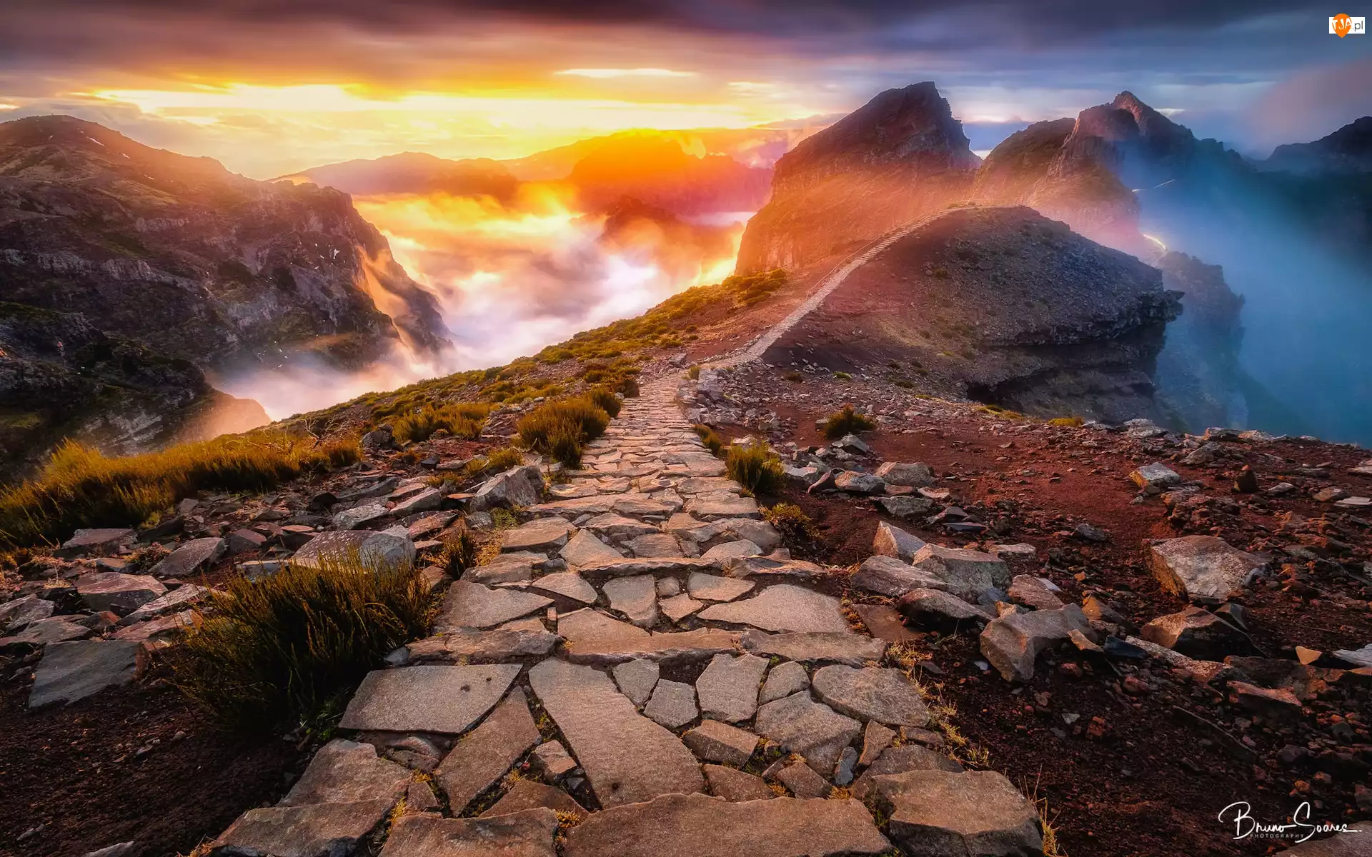 Mgła, Portugalia, Pico do Arieiro, Ścieżka, Madera, Zachód słońca, Kamienna, Góra
