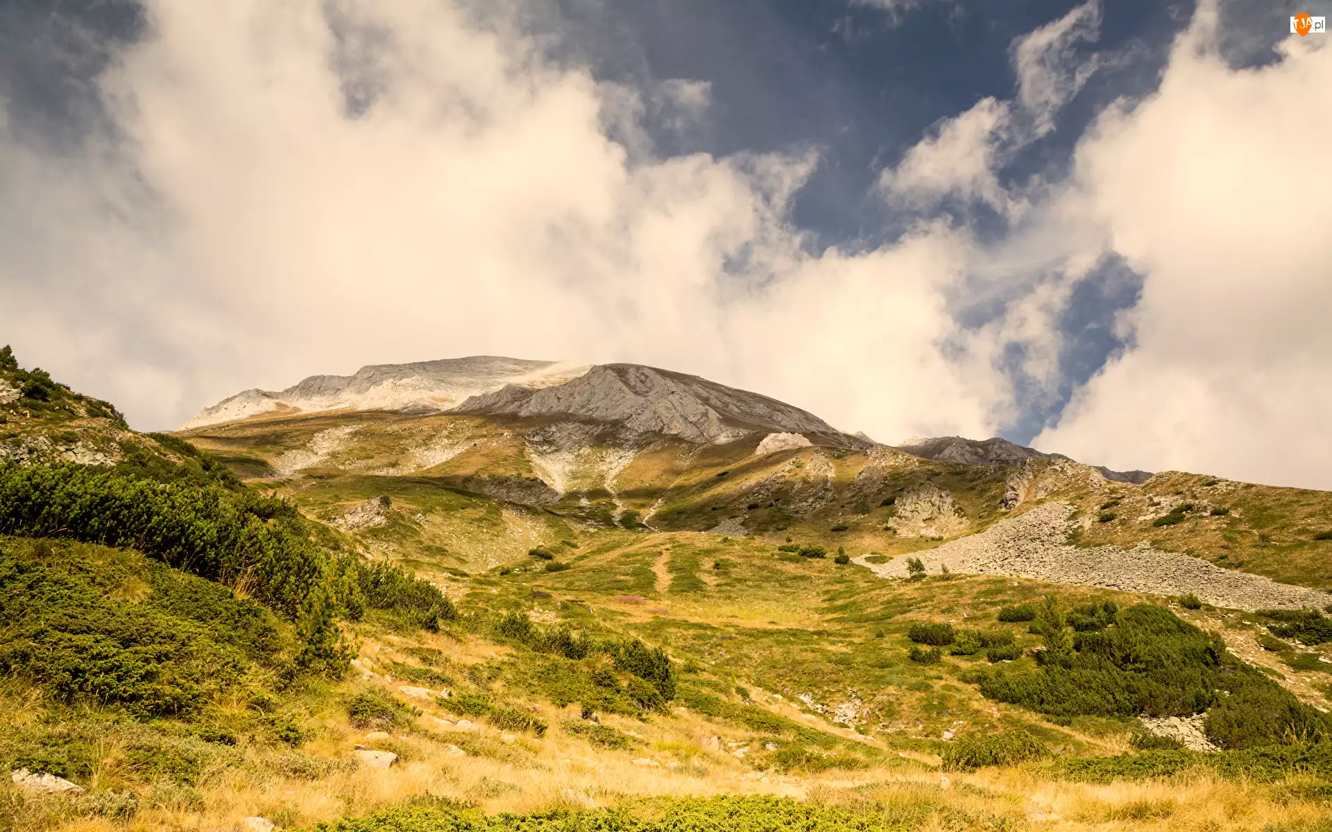 Góry Piryn, Góra Todorka, Niebo, Bułgaria, Chmury, Krzewy, Trawa