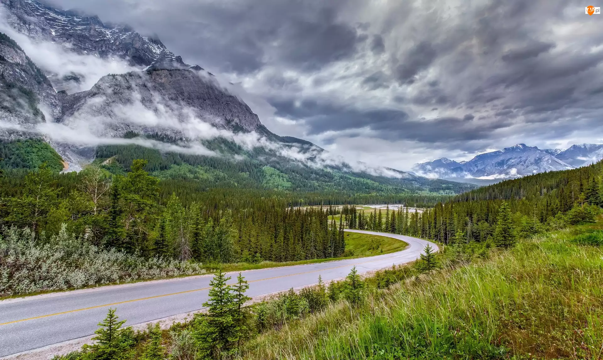 Drzewa, Chmury, Droga, Góry, Lasy