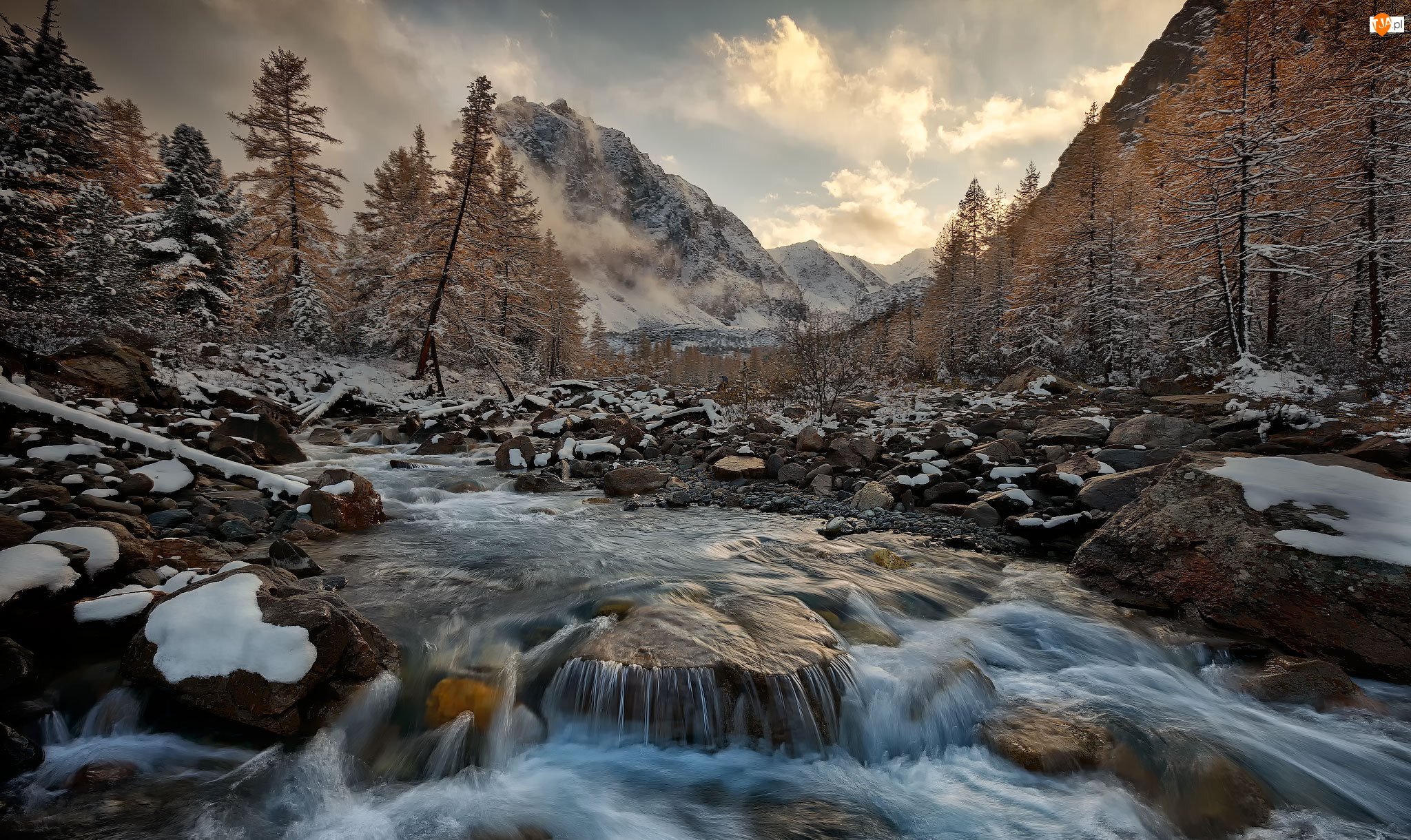Kamienie, Drzewa, Góry, Zima, Rzeka