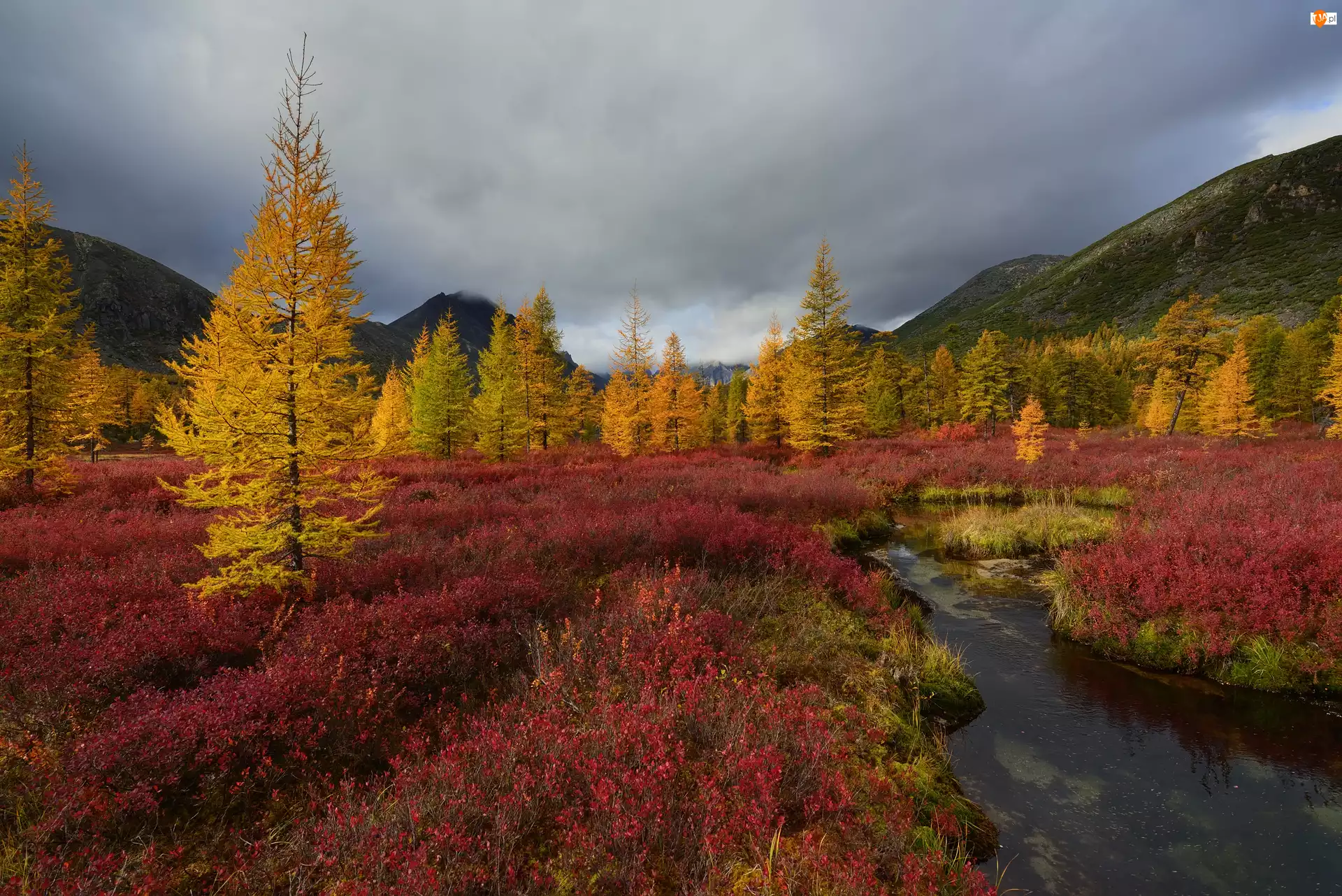 Rosja, Góry Kołymskie, Obwód magadański, Potok Nieznany, Kołyma, Drzewa, Rośliny, Jesień, Rzeka