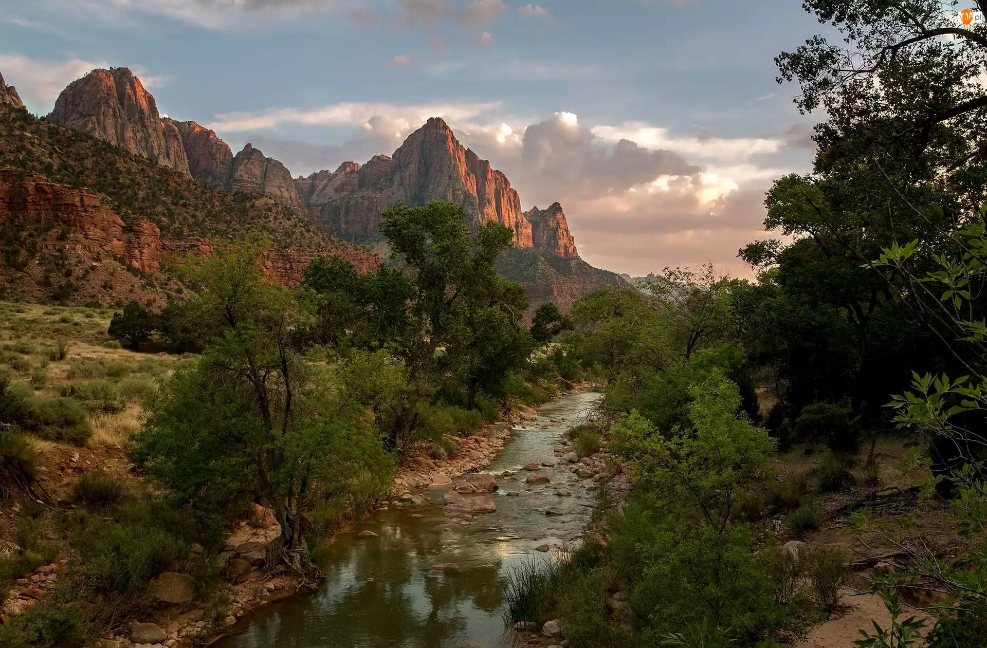 Góry Watchman, Park Narodowy Zion, Stan Utah, Drzewa, Rzeka Virgin River, Stany Zjednoczone