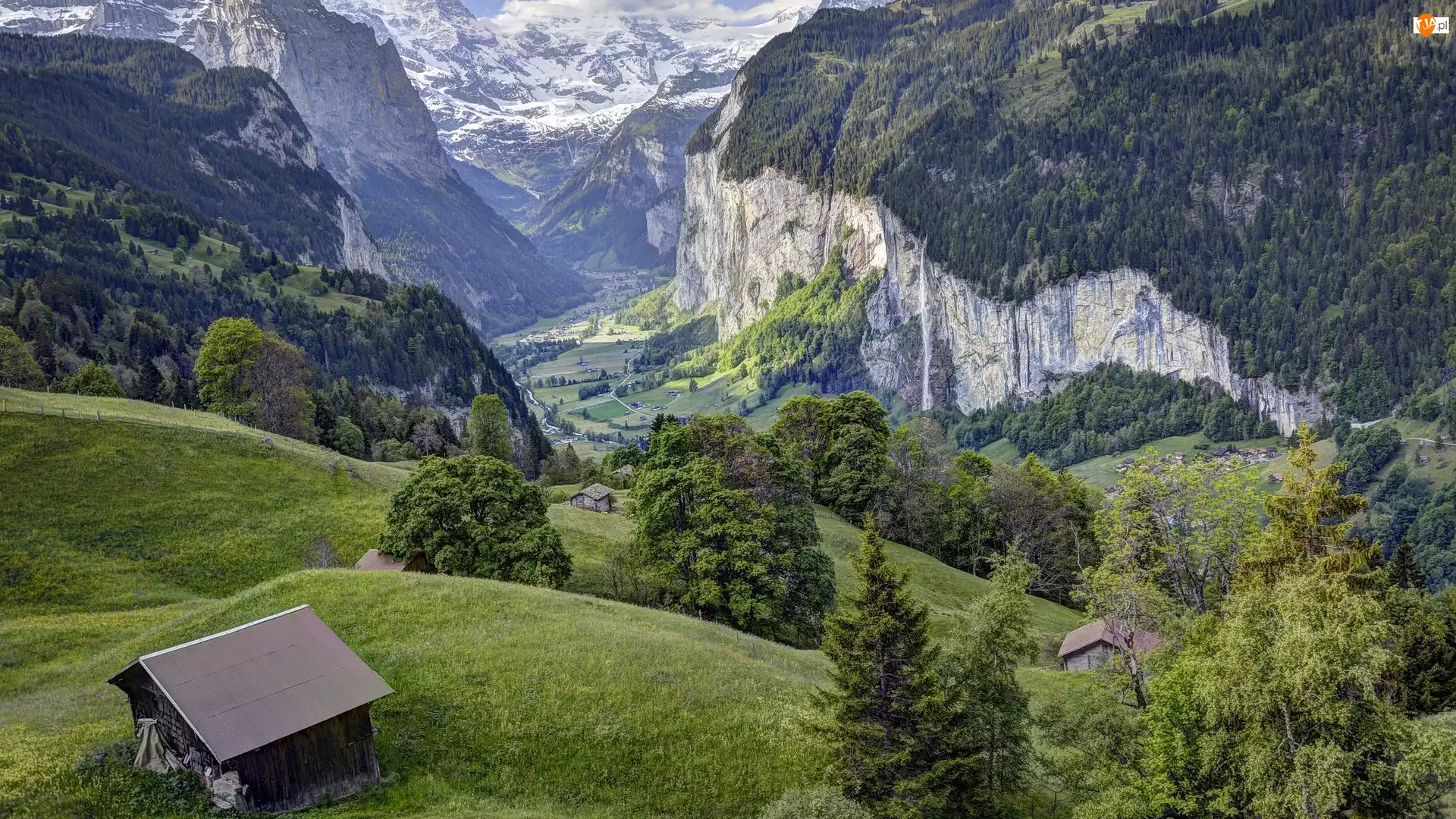 Dolina Lauterbrunnental, Domy, Góry Alpy Berneńskie, Szwajcaria, Drzewa