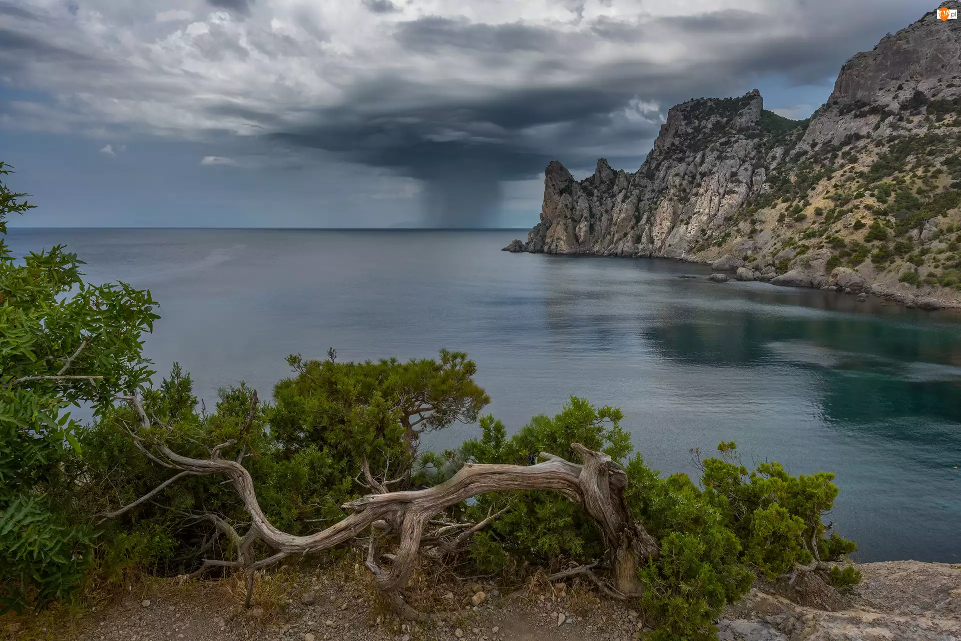 Skały, Góry, Roślinność, Chmury, Morze, Ciemne