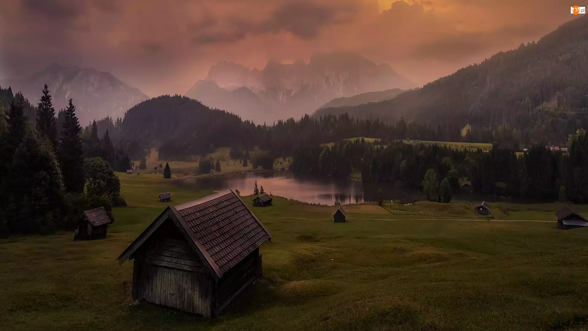Łąka, Bawaria, Domki, Wieczór, Trawa, Niemcy, Wzgórza, Miejscowośc Krun, Góry Alpy, Las, Jezioro Geroldsee, Chmury