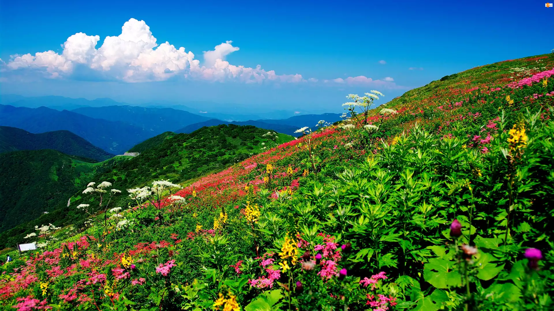Motylki, Obłoki, Drzewo, Ttrawa, Kolorowe, Niebo