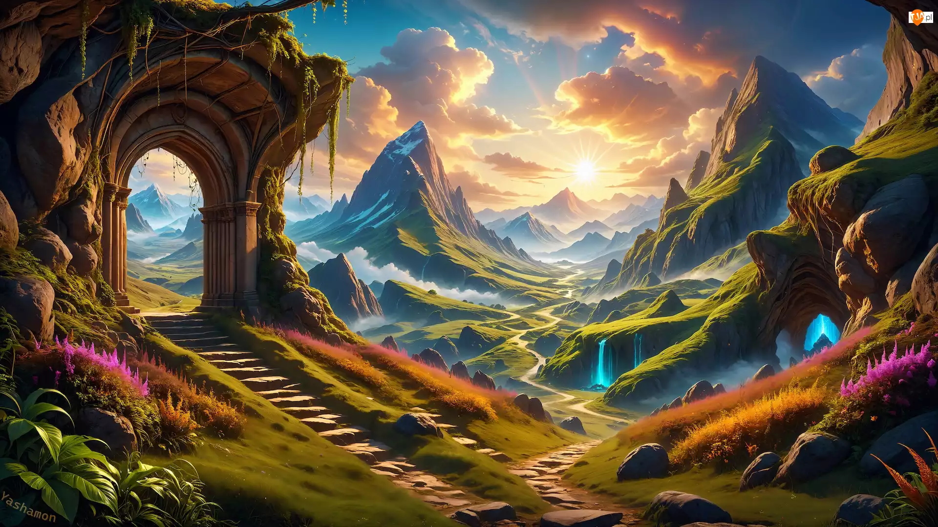 Góry, Budowla, Fantasy, Grafika, Roślinność, Schody, Łuk
