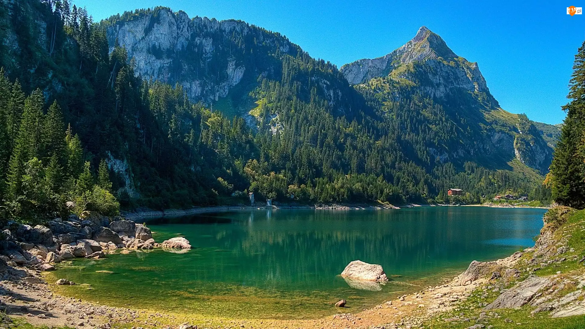 Budynki, Góry, Lasy, Jezioro