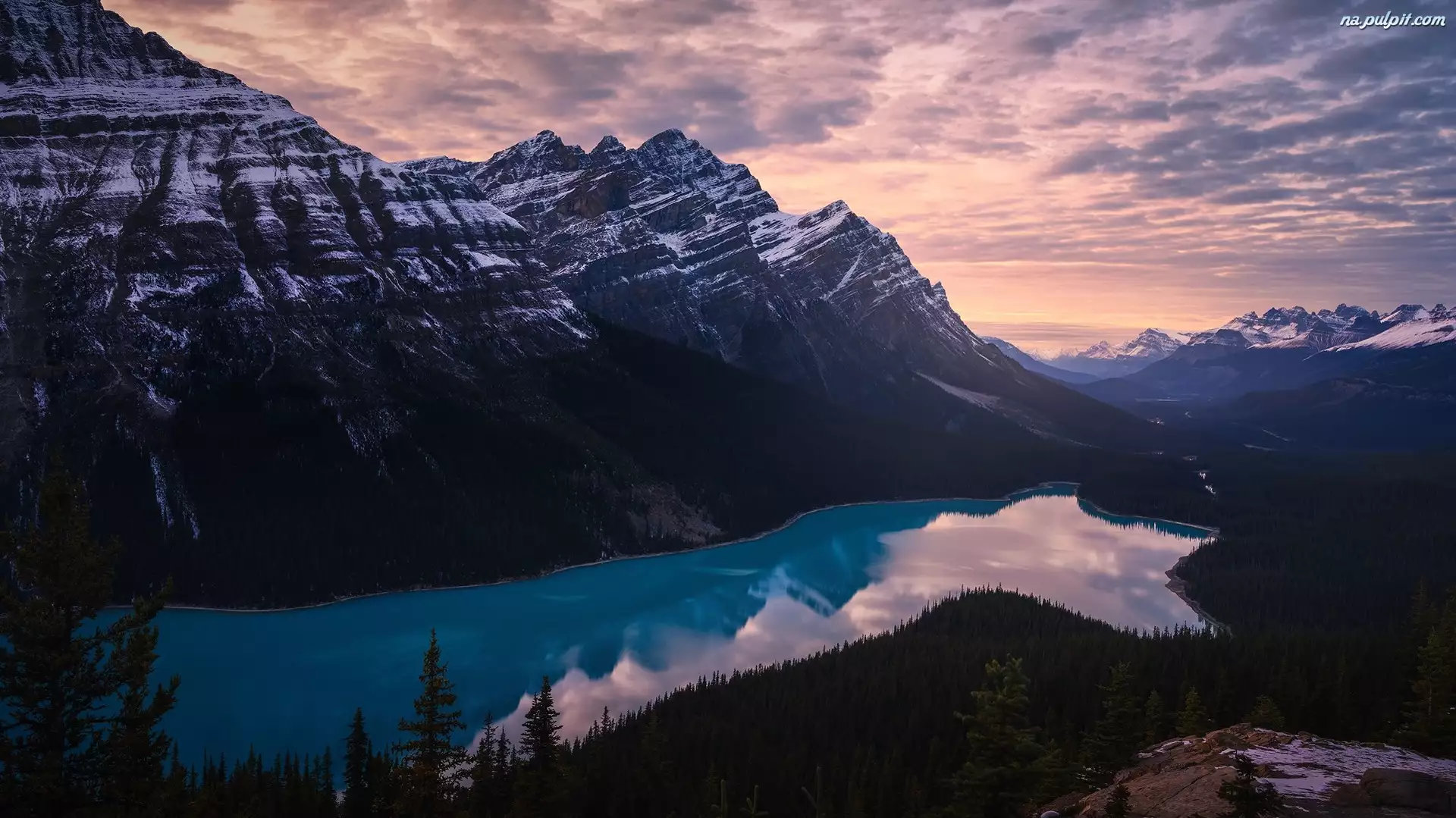 Góry, Chmury, Lasy, Zachód słońca, Jezioro, Prowincja Alberta, Skały, Park Narodowy Banff, Drzewa, Peyto Lake, Kanada