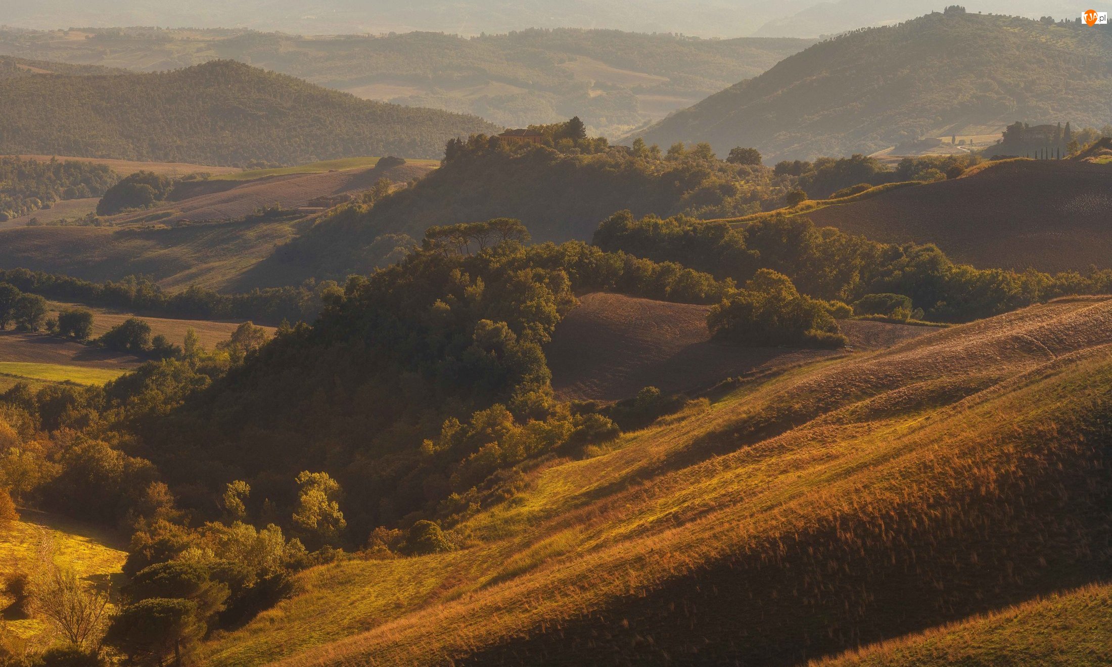 Wzgórza, Drzewa, Włochy, Domy, Toskania, Jesień