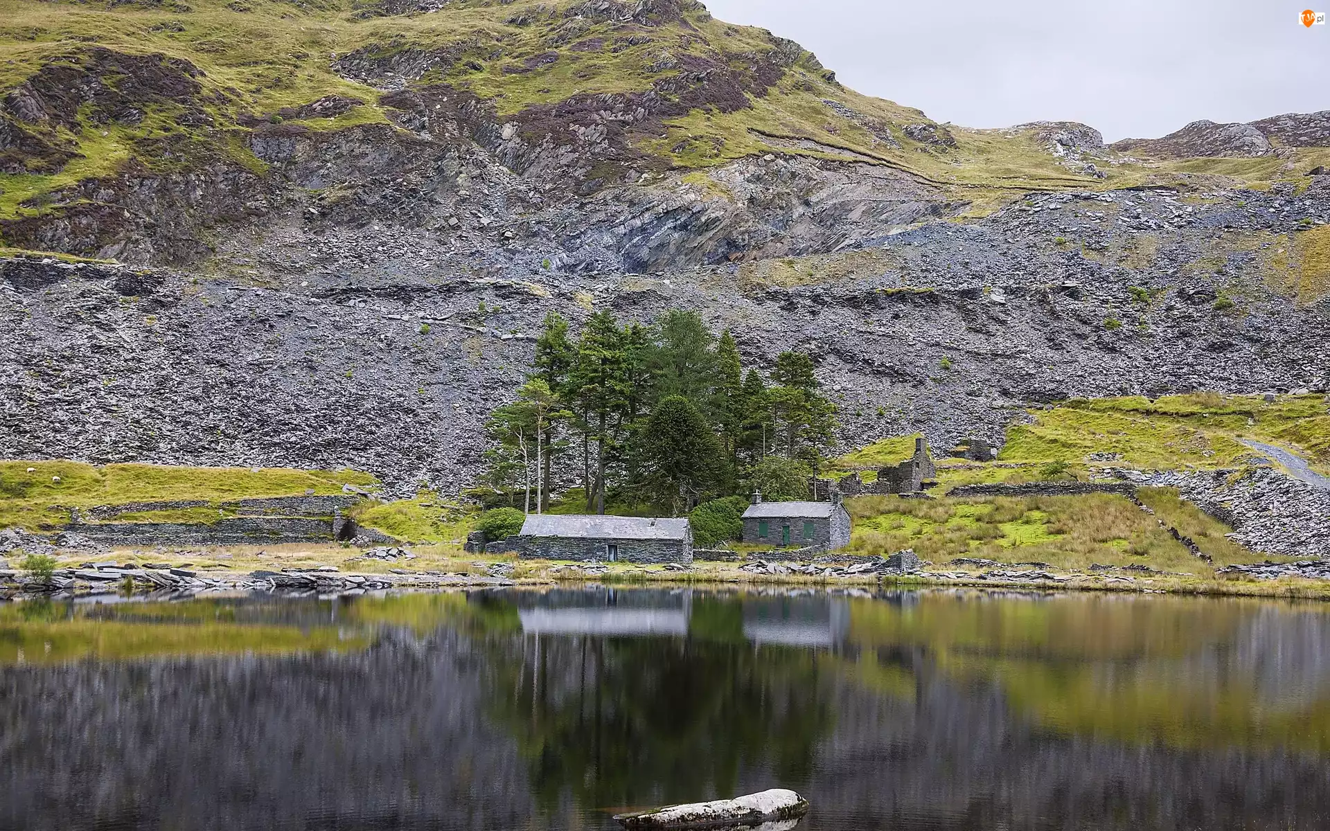Góry, Domy, Drzewa, Jezioro