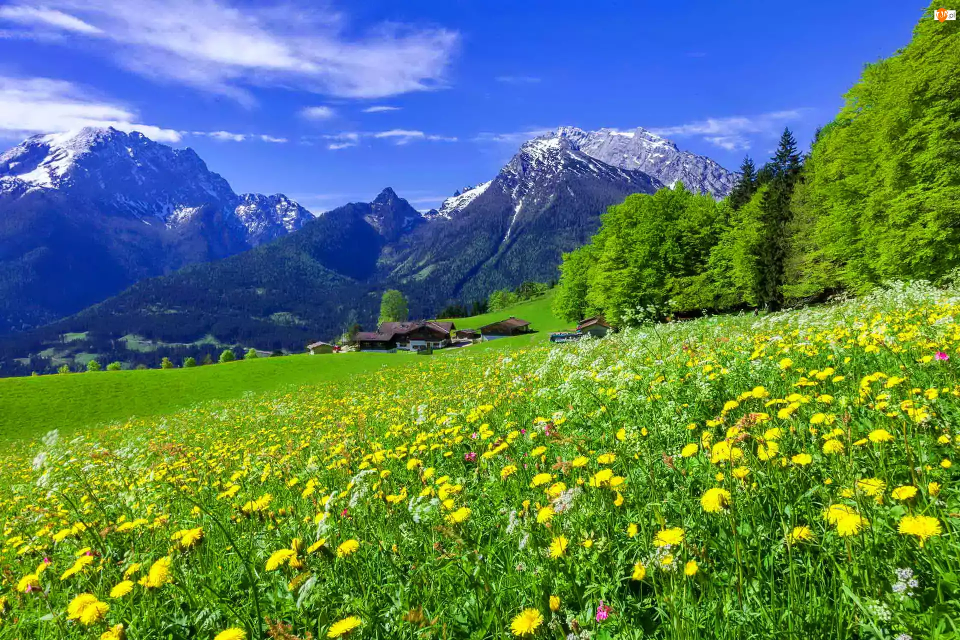 Góry, Domy, Łąka, Wiosna, Kwiaty, Lasy