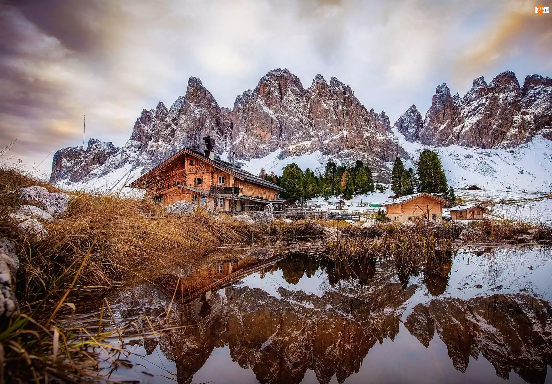 Góry, Domy, Zima, Odbicie, Jezioro, Drzewa