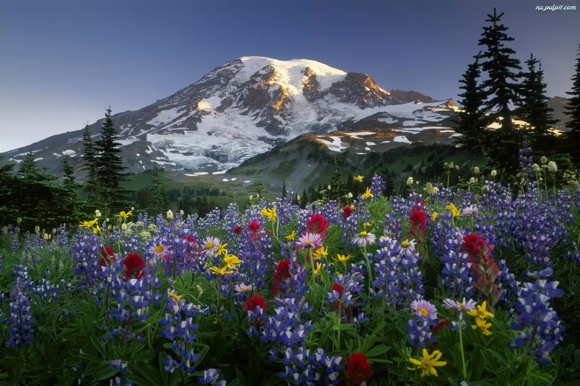 Stany Zjednoczone, Łubin, Chmury, Kwiaty, Góry, Park Narodowy Mount Rainier, Drzewa, Stratowulkan Mount Rainier, Łąka, Stan Waszyngton