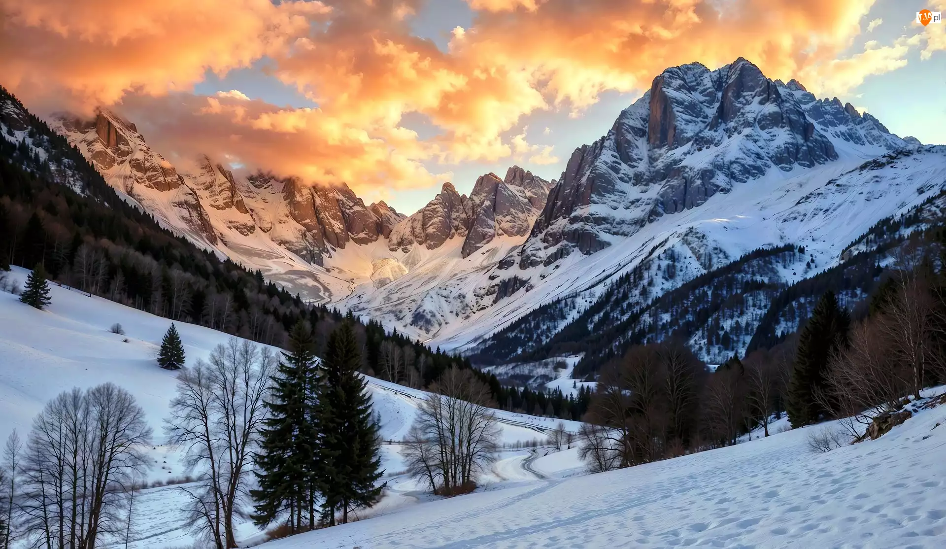 Góry, Drzewa, Niebo, Zima, Chmury, Dolina, Śnieg