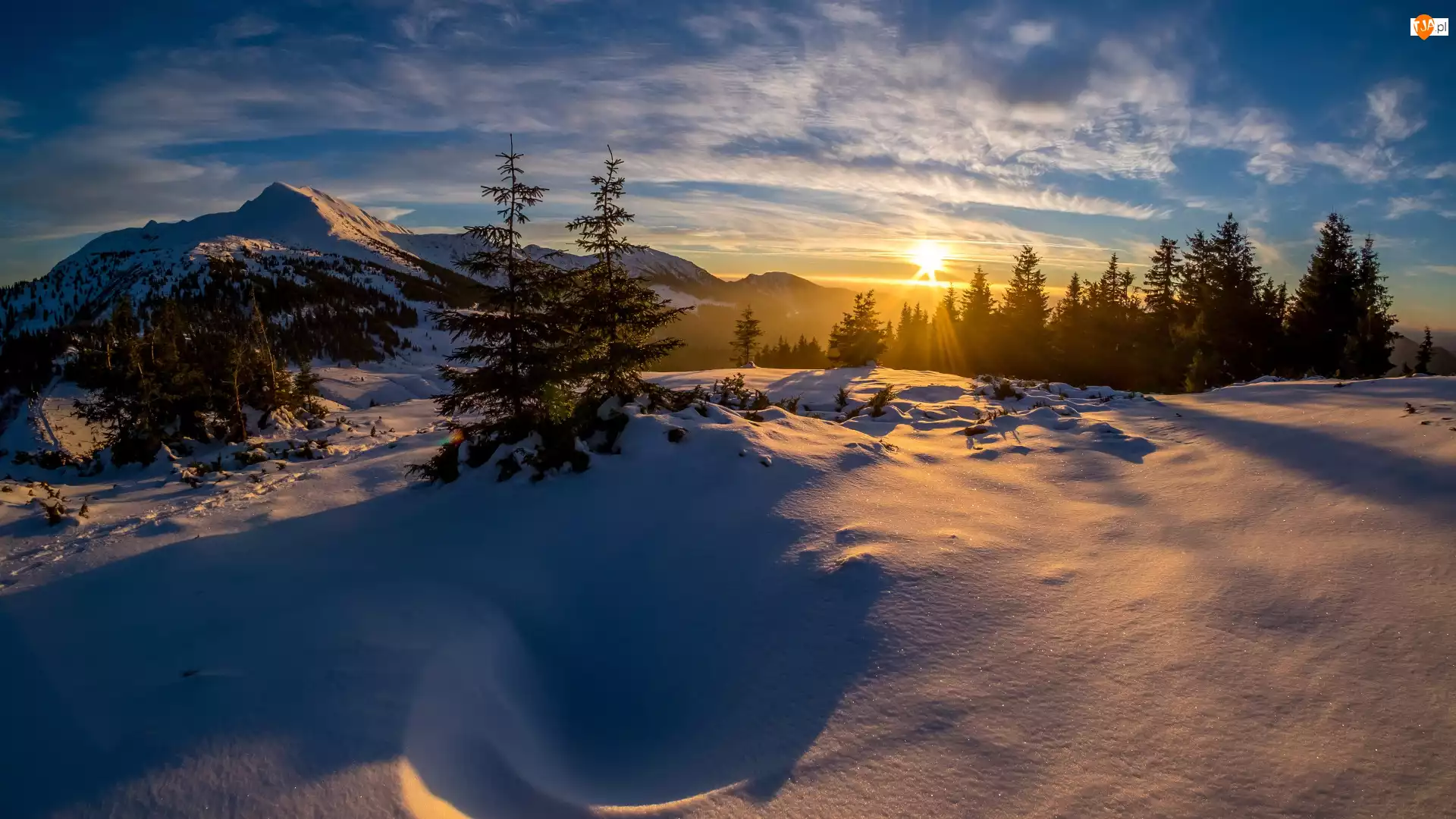 Góry, Drzewa, Zachód słońca, Zima, Niebo, Śni