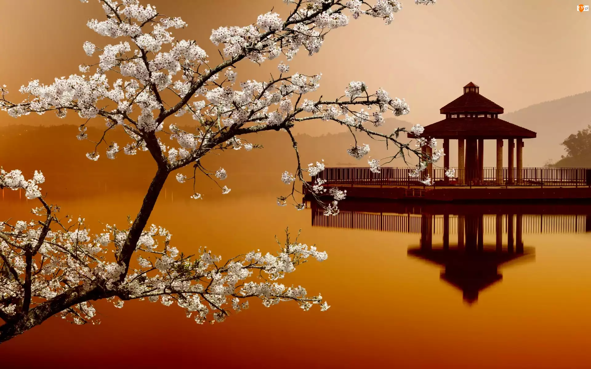 Góry, Drzewo, Rzeka, Japonia, Pomost, Kwitnące
