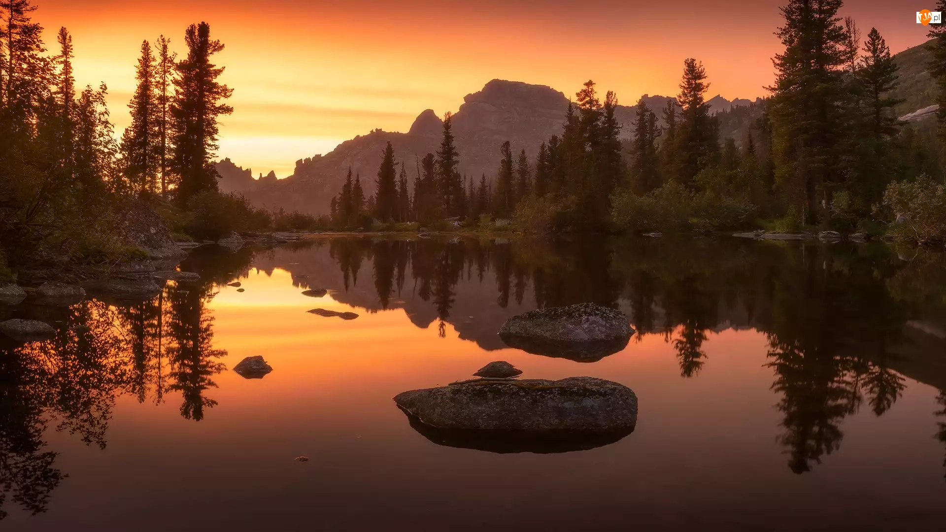 Zachód słońca, Rosja, Drzewa, Jezioro, Góry Ergaki