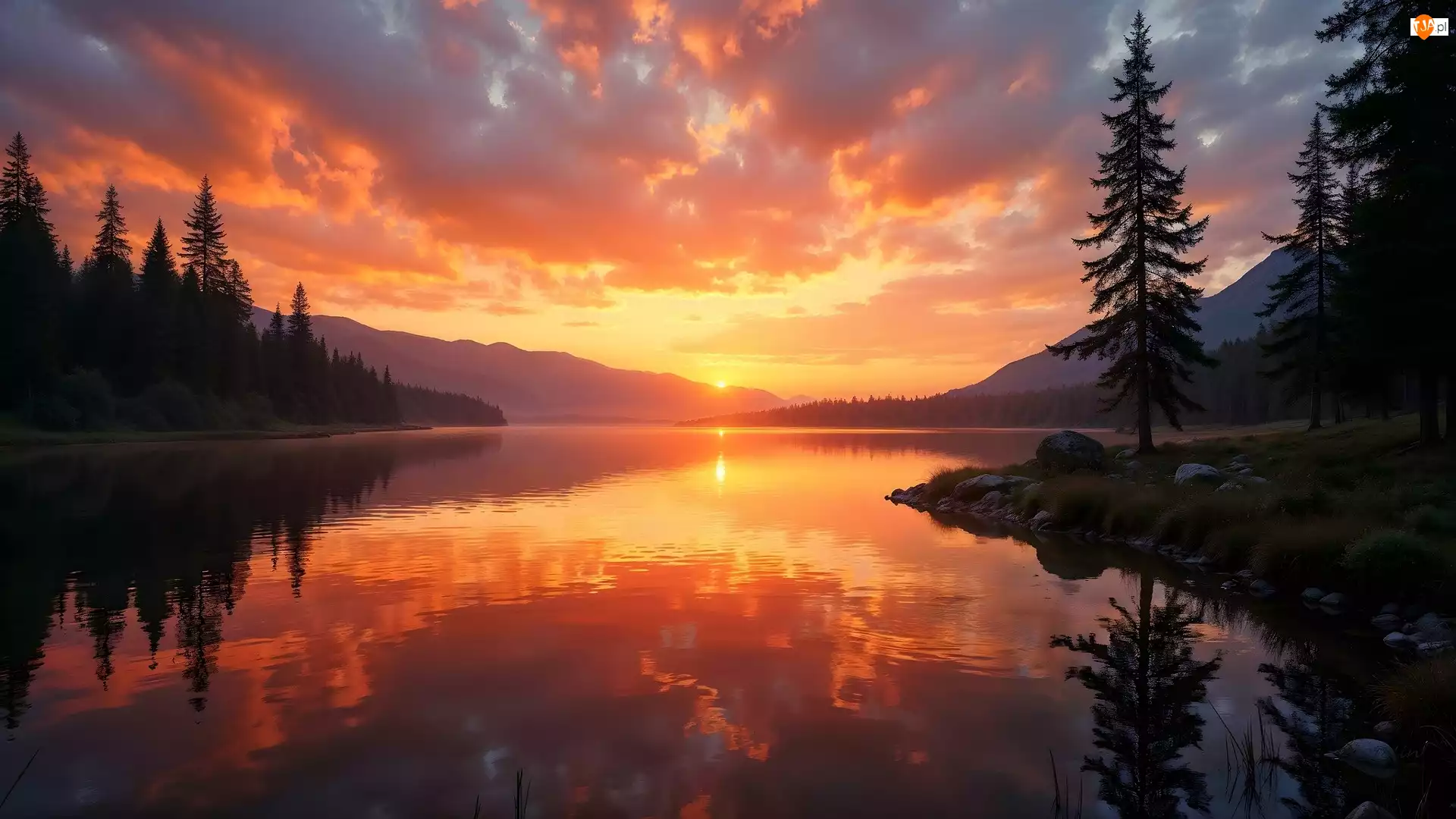 Góry, Grafika AI, Drzewa, Jezioro, Zachód słońca