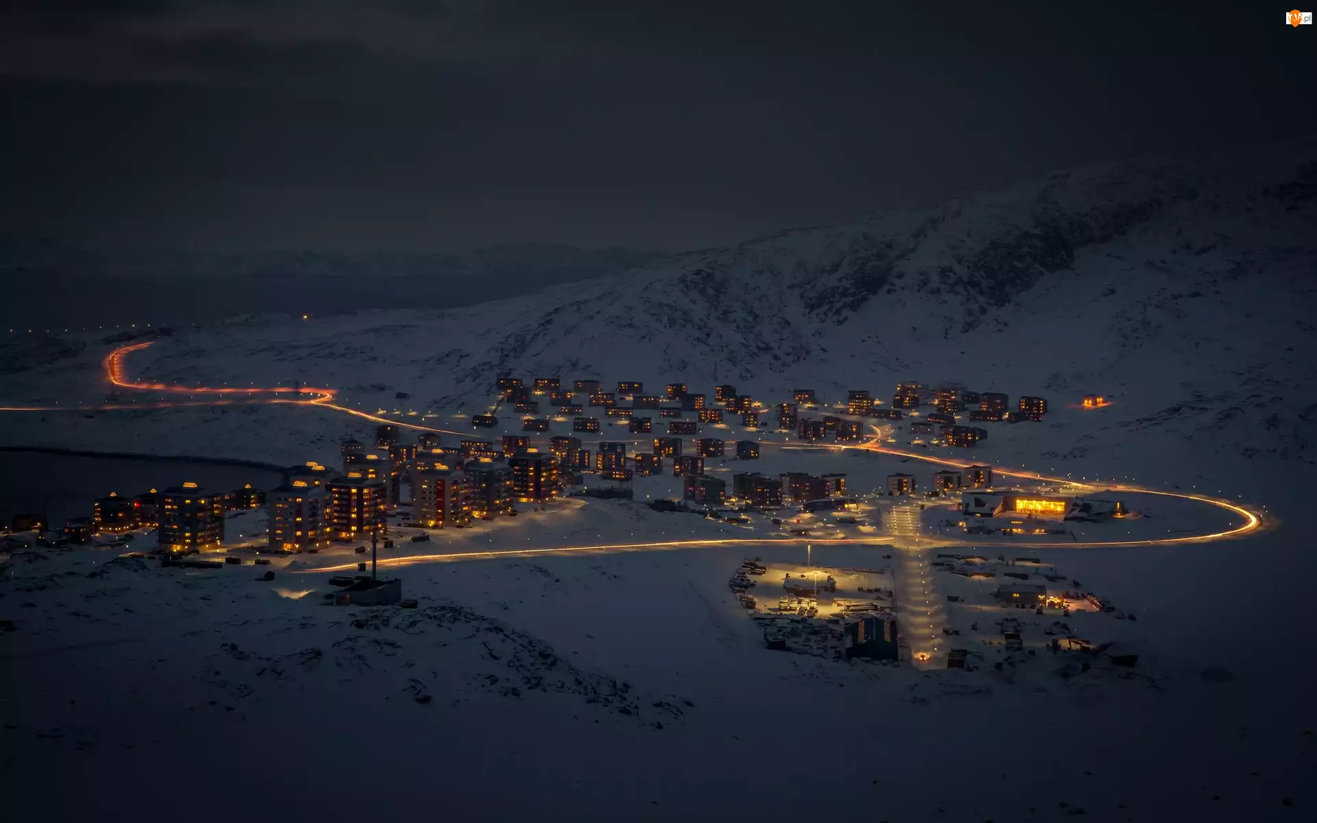 Góry, Grenlandia, Nocą, Miasto, Zima