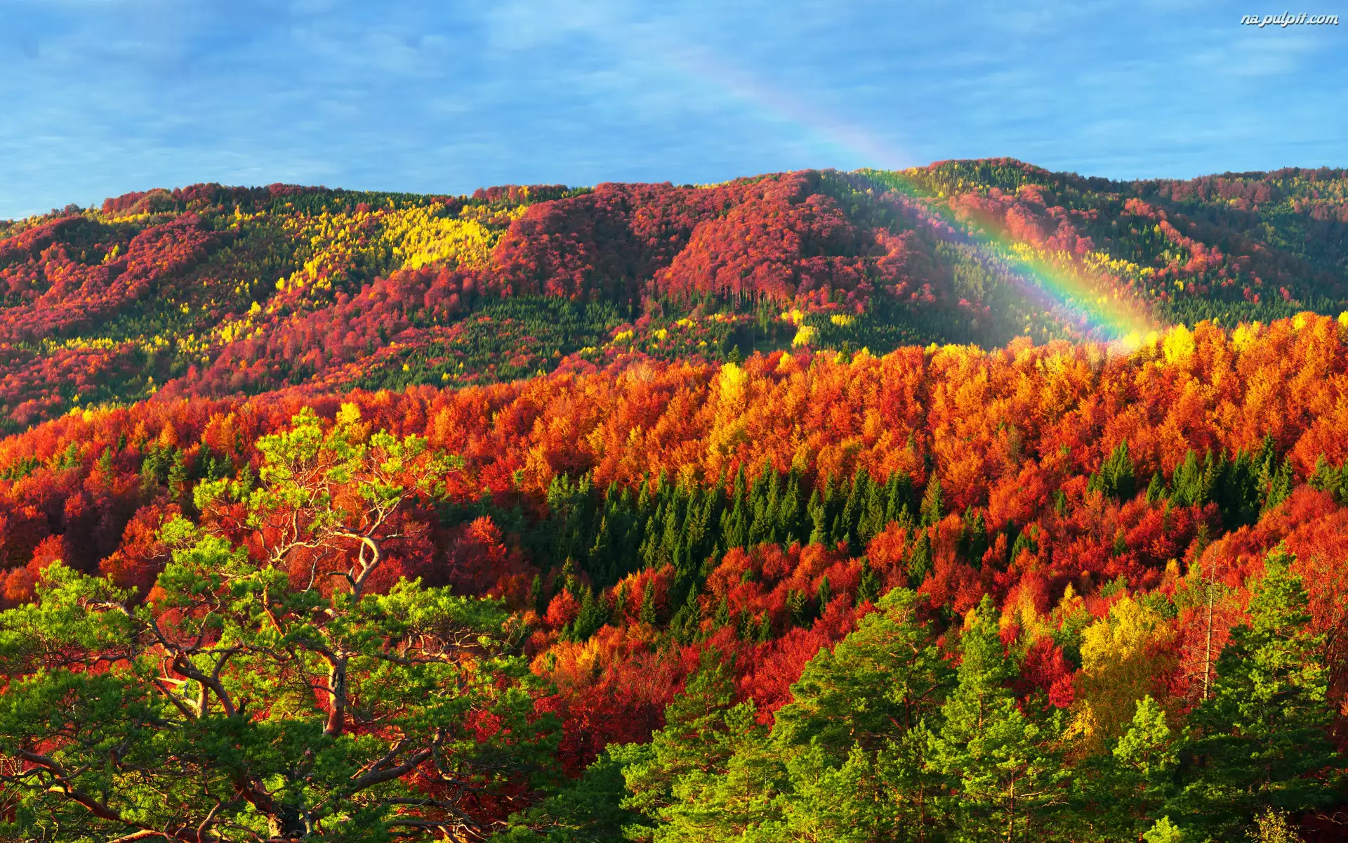 Góry, Jesień, Kolorowe, Tęcza, Lasy, Drzewa
