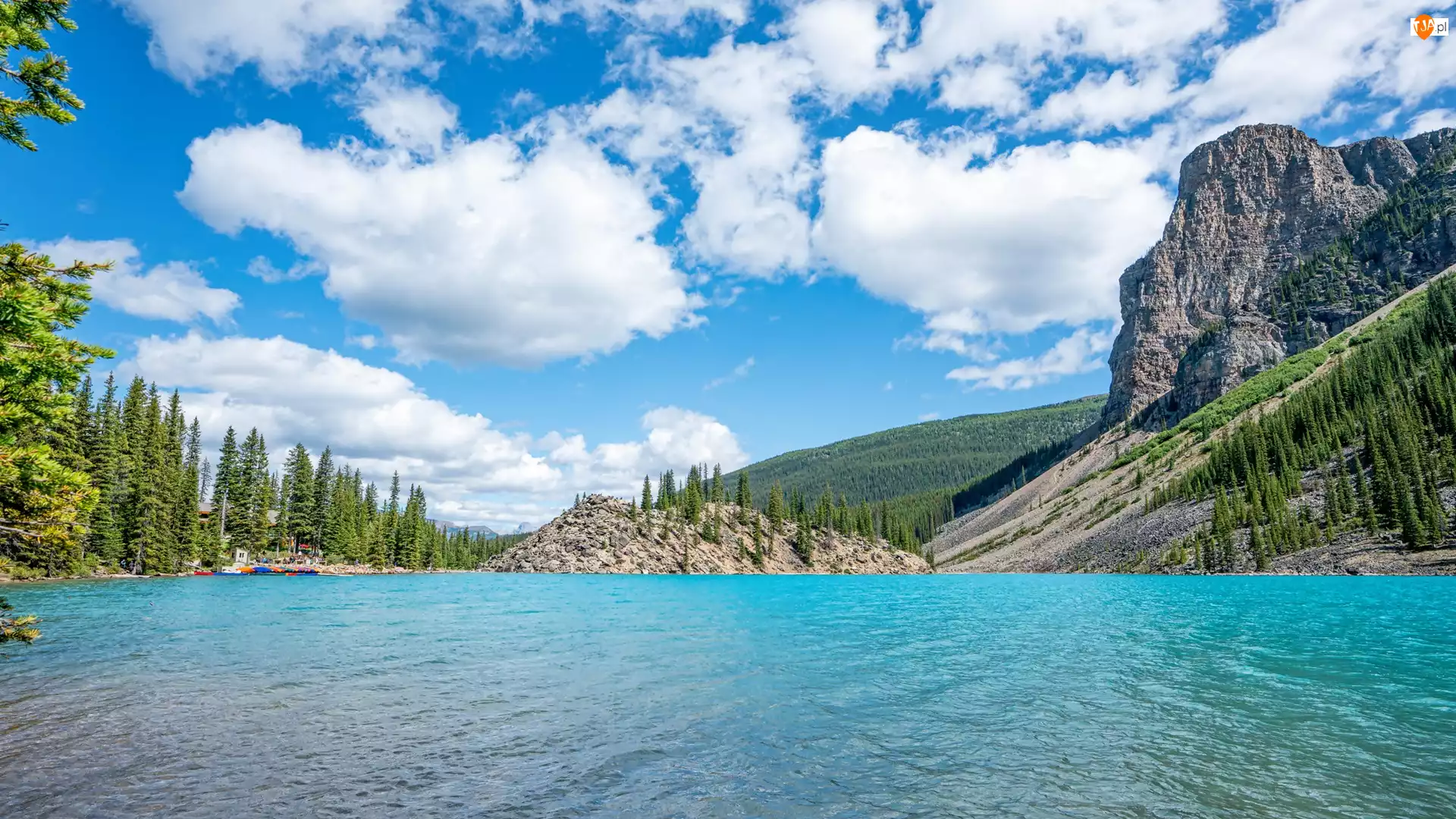 Góry, Jezioro Moraine, Kanada, Park Narodowy Banff, Prowincja Alberta, Chmury, Drzewa