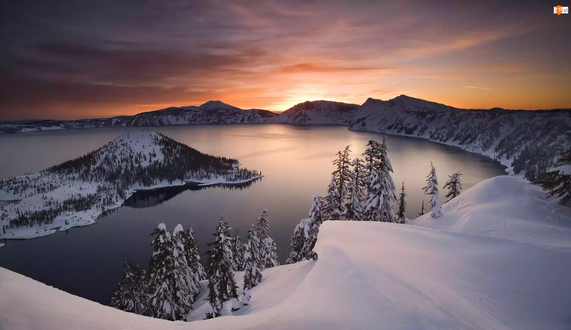 Góry, Jezioro, Zaspy, Choinki, Śnieżne