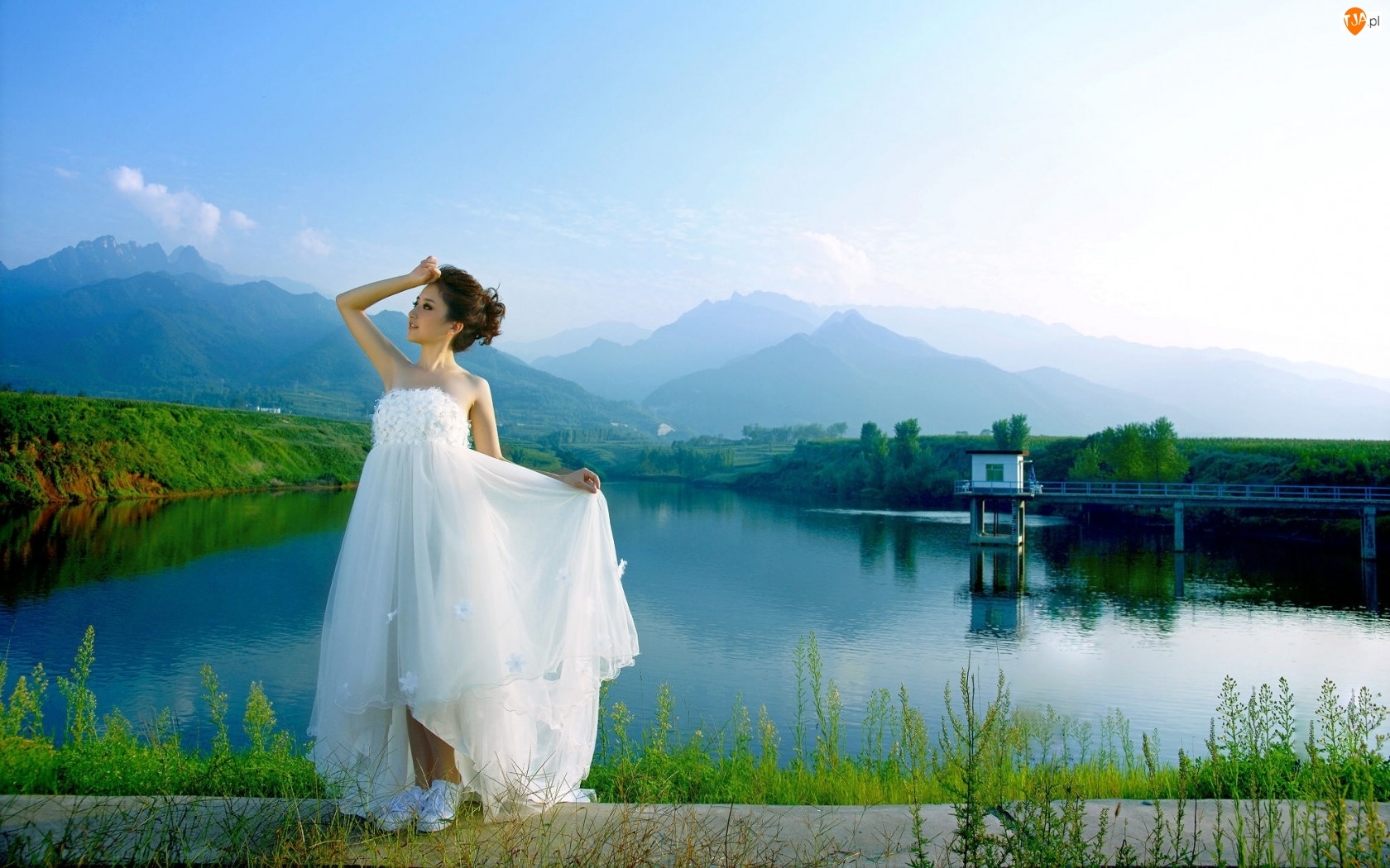 Góry, Kobieta, Sukienka, Biała, Jezioro