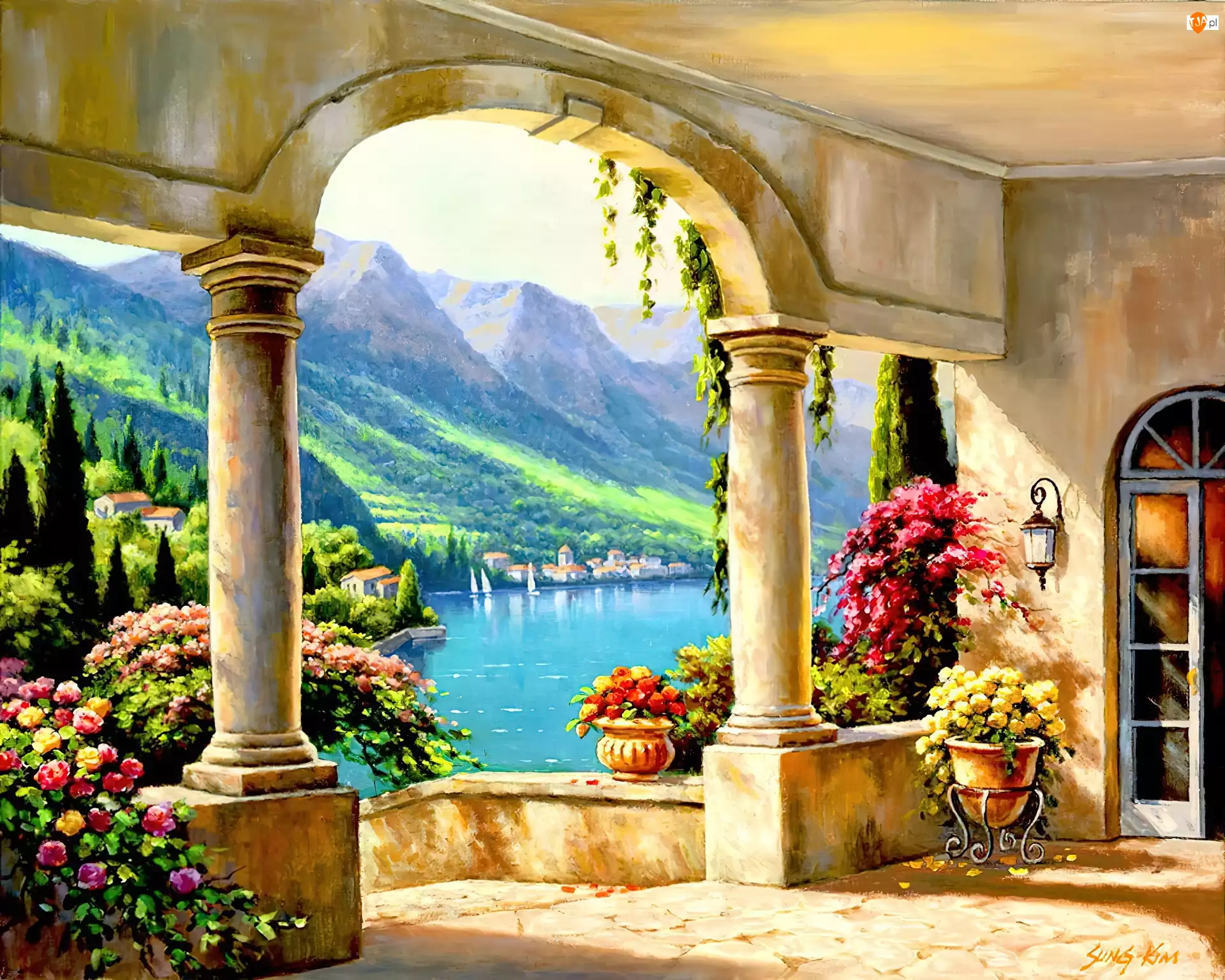 Widok, Taras, Jezioro, Kwiaty, Góry, Kolumny
