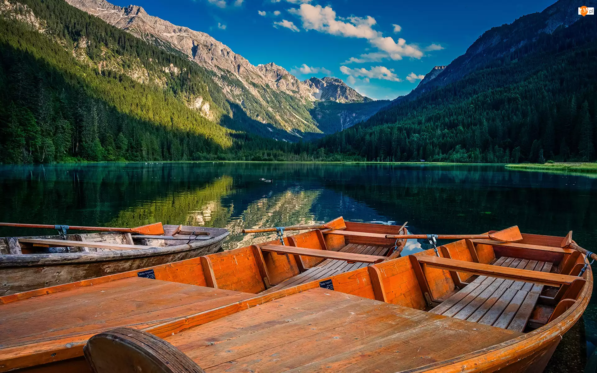 Góry, Las, Łódki, Austria, Jagersee, Jezioro, D