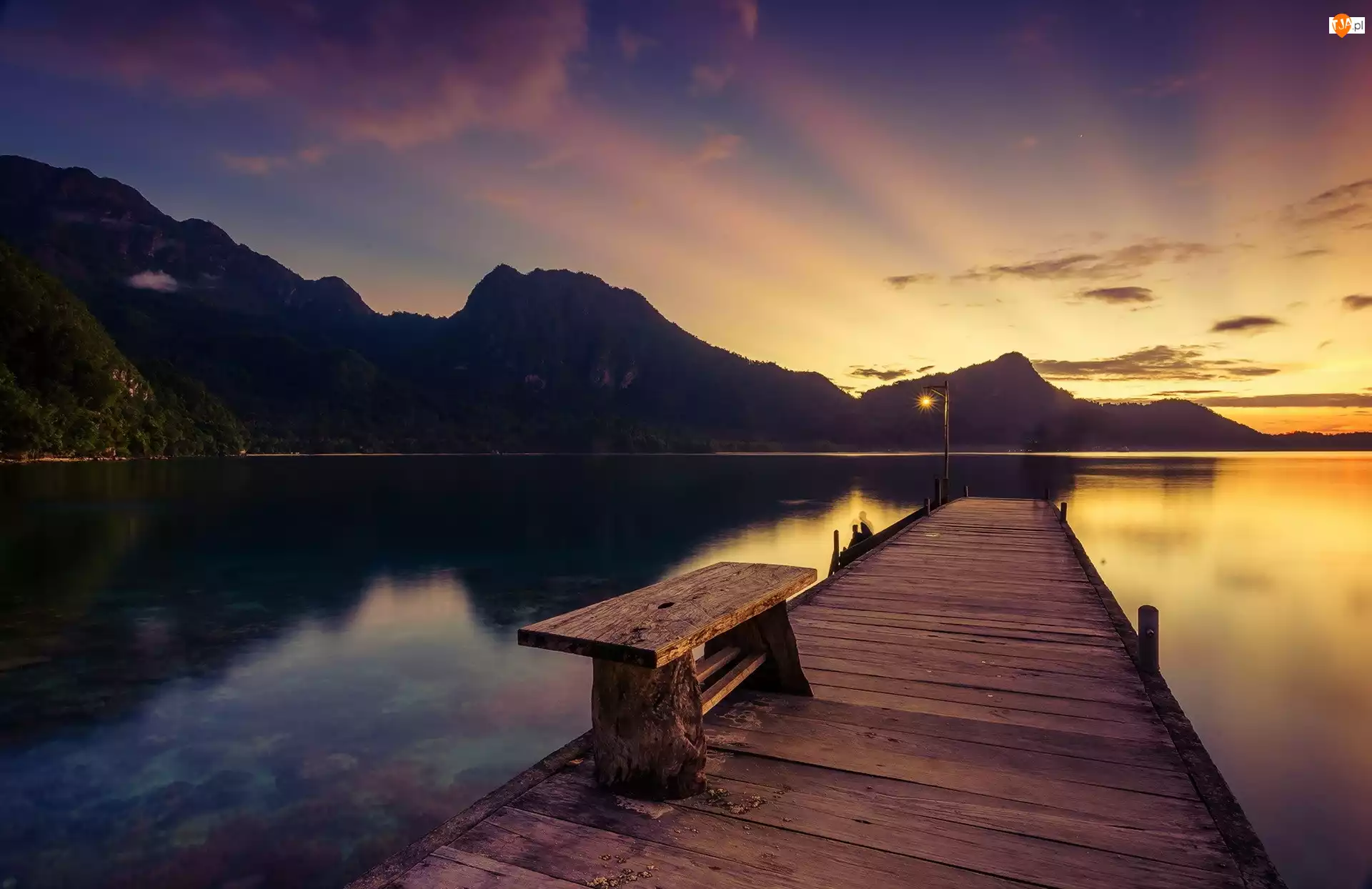 Świt, Łódki, Wschód, Pomost, Słońca, Jezioro