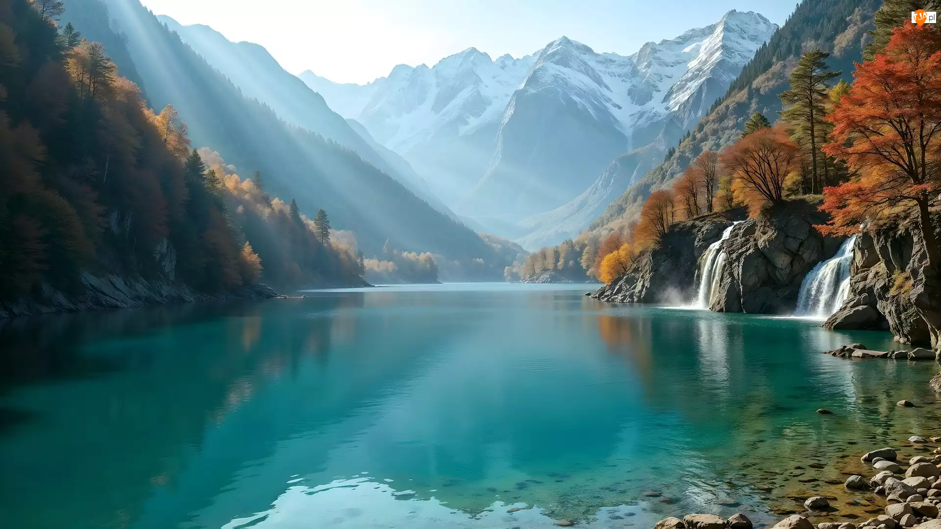 Drzewa, Góry, Wodospady, Jesień, Jezioro, Las, Mgła, Kamienie